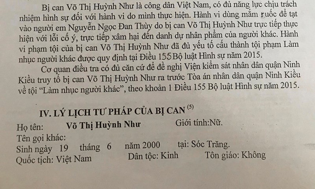 Cơ quan Cảnh sát điều tra Công an quận Ninh Kiều (TP Cần Thơ) vừa cho biết đã kết thúc điều tra vụ án, chuyển VKS cùng cấp đề nghị truy tố đối với Võ Thị Huỳnh Như (18 tuổi, ngụ quận Ninh Kiều) về tội “làm nhục người khác”.