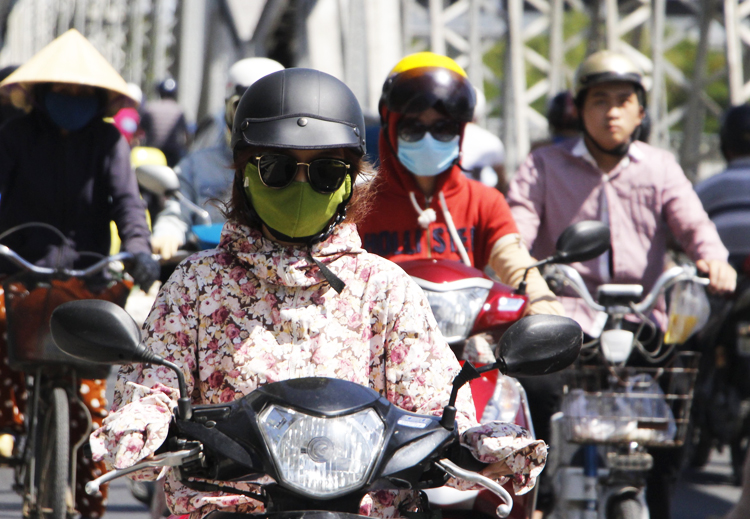 Người dân TP Huế (Thừa Thiên Huế) che chắn kín mít khi qua cầu Trường Tiền. Ảnh: Võ Thạnh