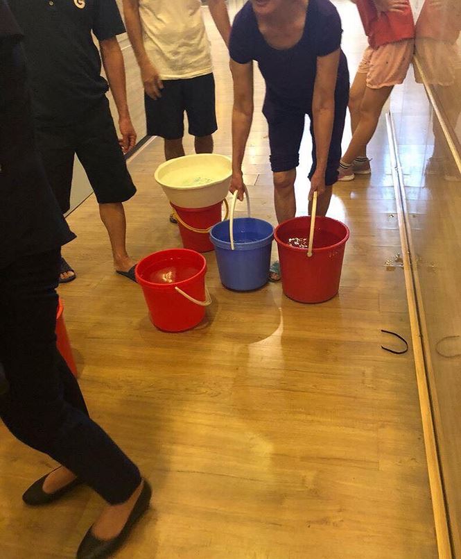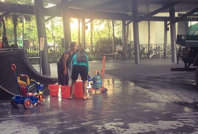 Người dân khu đô thị cao cấp Mulberry Lane phải xách từ xô, chậu nước từ dưới sảnh lên nhà. (Ảnh cư dân cung cấp)