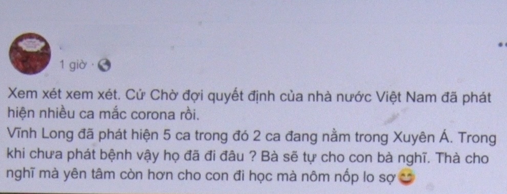 Theo xác minh, trong ngày 31/1, chị A.X đã sử dụng tài khoản Facebook L.X.B.X đăng tải nội dung: “Vĩnh Long đã phát hiện 5 ca trong đó có 2 ca nằm trong Bệnh viện Xuyên Á”. Thông tin này sau đó được chia sẻ rộng rãi và gây hoang mang cho dư luận.