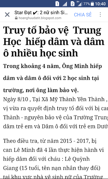 Bài viết nêu rõ: “Trong 4 năm ông Minh hiếp dâm và dâm ô với hai học sinh tại Trường THCS xã Mỹ Thành, nơi ông Minh làm bảo vệ…