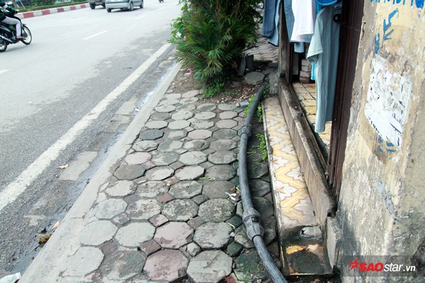 Đường ống nước chạy loằng ngoằng trước của nhà và trên vỉa hè.
