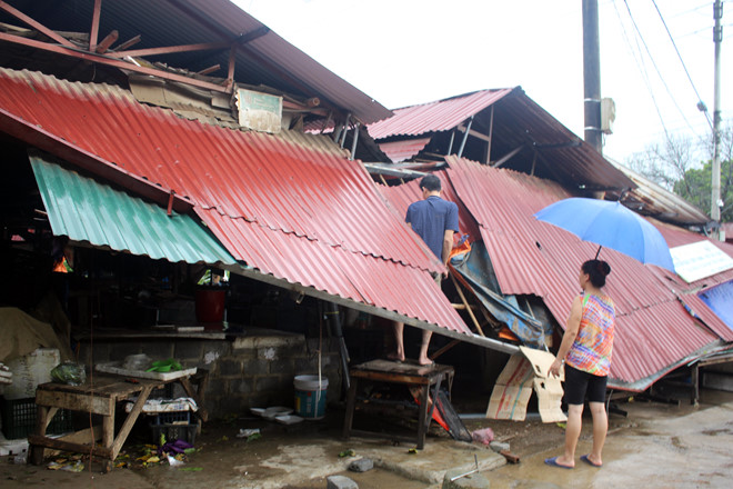 Tố lốc, vòi rồng làm sập nhiều mái tôn của người dân ở Chợ B6, TP Lào Cai. Ảnh: Báo Lào Cai.