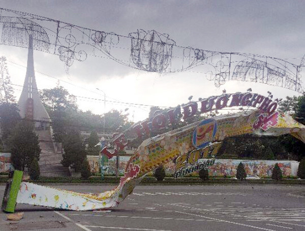 Gió lớn do ảnh hưởng của bão số 6 làm hư hỏng biển quảng cáo ở TP Lào Cai. Ảnh: Báo Lào Cai.