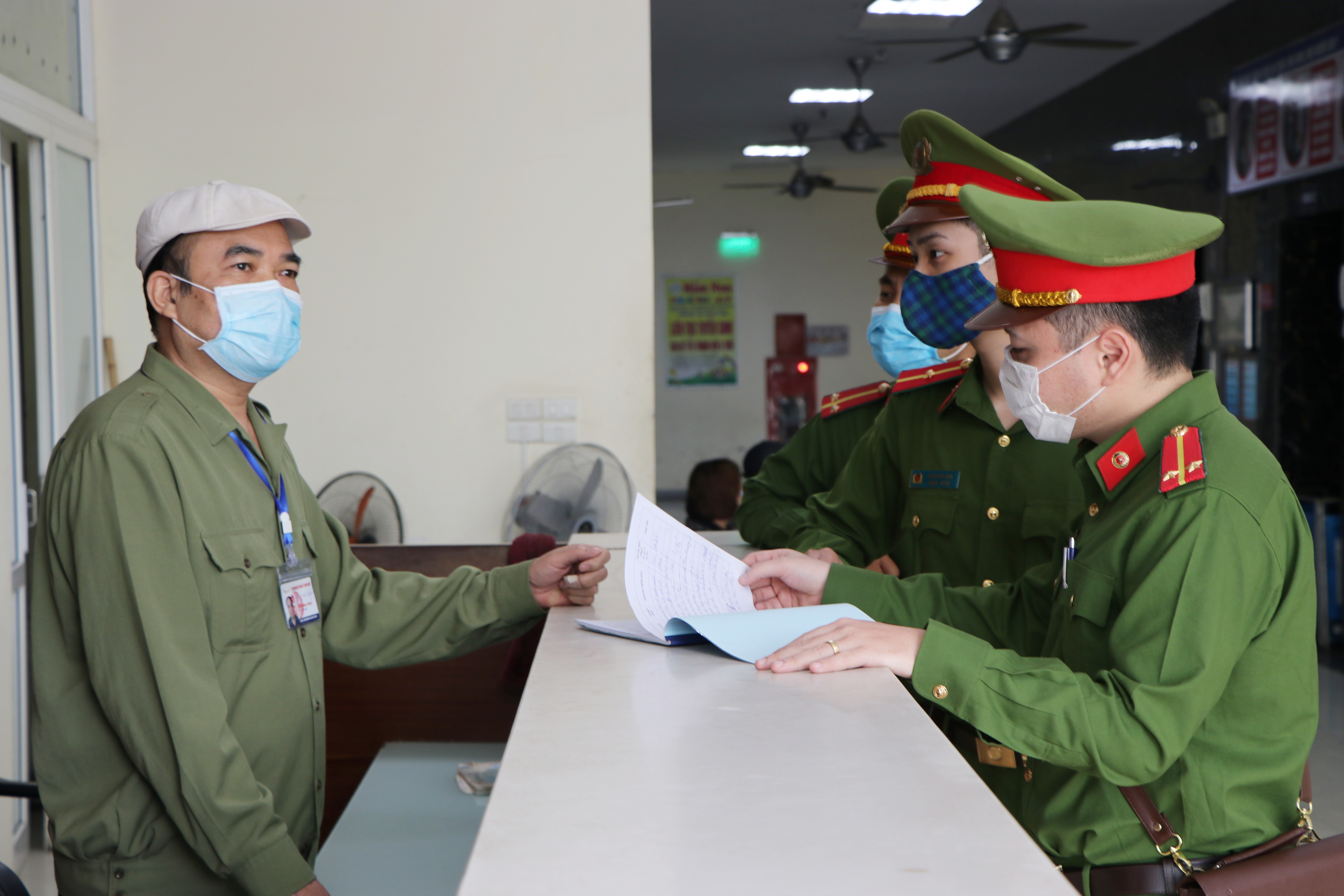Công an làm việc với đại diện toà nhà HH1A để tiến hành phun thuốc khử trùng.