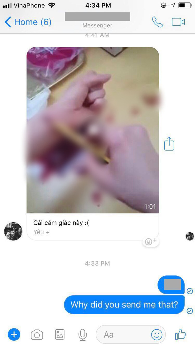 “Tôi thường làm ngơ đi khi anh ta gửi những clip như thế. Nhưng đến khi anh ta gửi clip có 1 cô gái cắt tay thì tôi thực sự khó chịu. Đó rõ ràng là 1 clip cắt tay thật và tôi đã nổi giận với anh ta. Thế mà anh ta lại nói với tôi đó chỉ là 1 clip vui thôi, rồi cười tôi” - L.A kể lại.