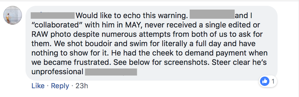 “Đừng làm việc với anh ta nữa. Tôi khuyên nếu có làm việc với bất kỳ nhiếp ảnh gia nào bạn nên ký kết hợp đồng đầy đủ” - người bạn tên J.R bình luận.