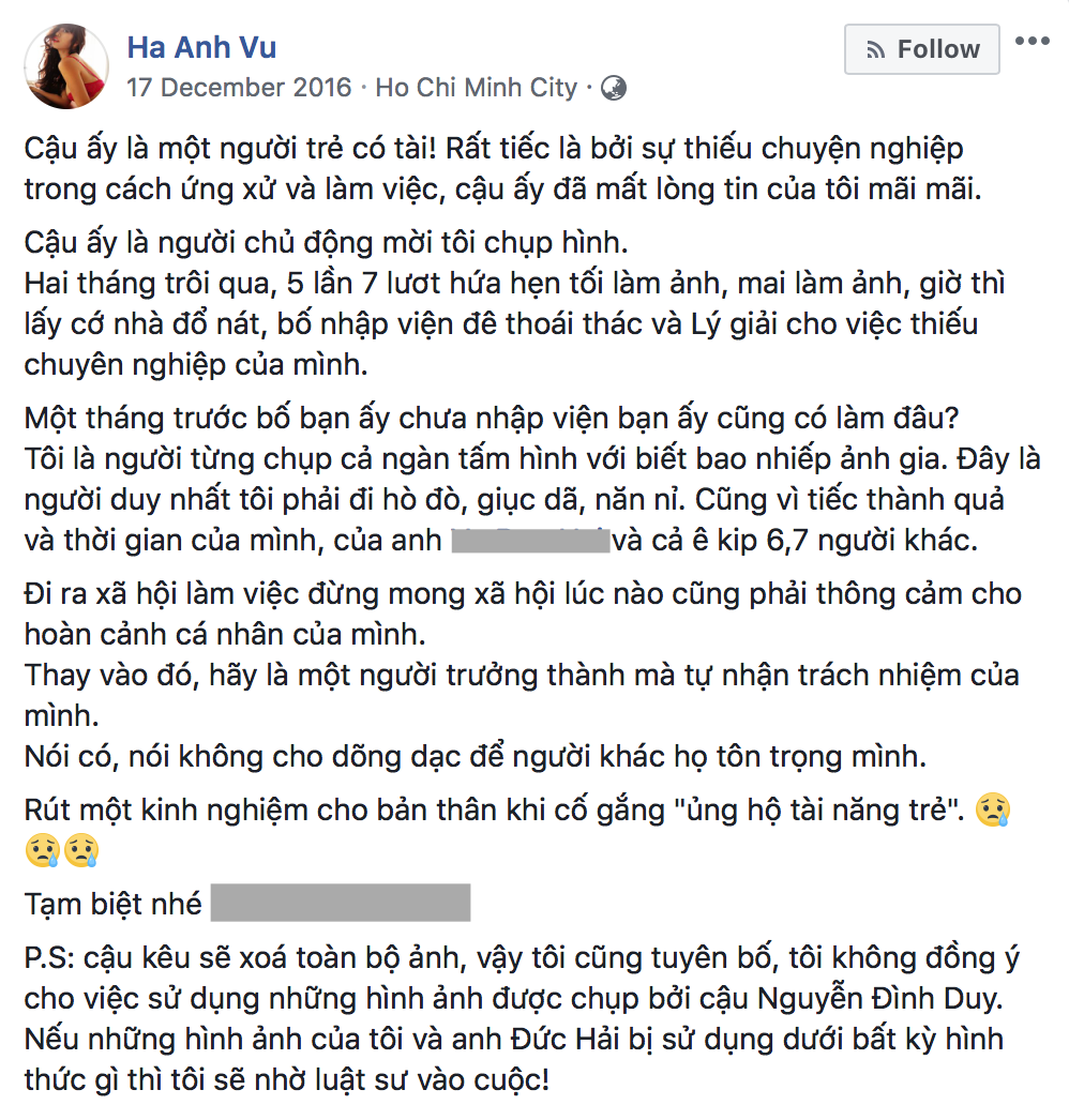 “Tôi đã hợp tác chụp ảnh với nhiếp ảnh gia N.Đ.D vào ngày 27/7 nhưng đến giờ anh ta vẫn từ chối gửi ảnh cho tôi. Tôi đã hỏi anh ta rất nhiều lần và kiên nhẫn chờ đợi (tôi biết mất bao lâu để sửa bộ ảnh chứ), mỗi lần tôi hỏi anh ta đều nói “hôm nay” nhưng rồi vẫn không gửi” - nữ người mẫu viết trên Facebook.