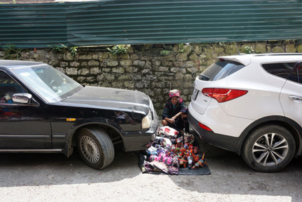 Một người dân tranh thủ khoảng không chật hẹp giữa 2 chiếc ô tô để bán đồ lưu niệm. Ảnh: LN.