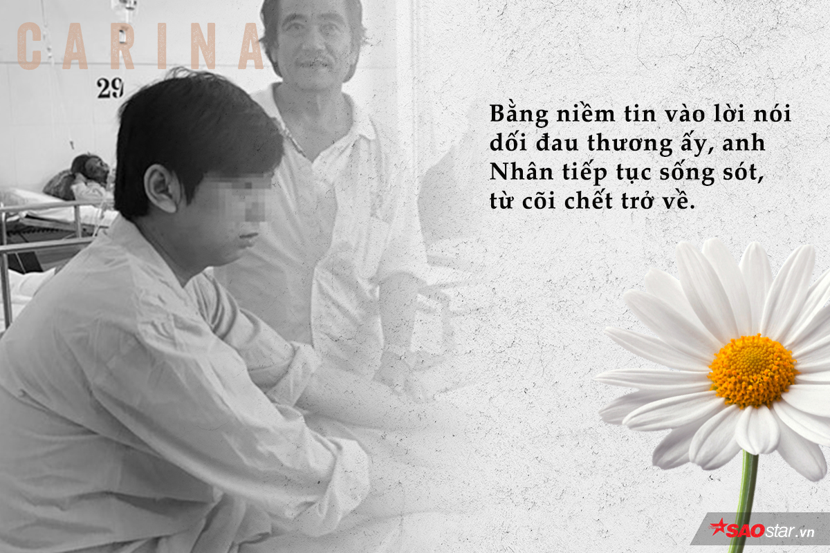Nhớ lại ngày đầu tiên hồi tỉnh, bà Ly vẫn nghẹn ngào trước câu hỏi của anh, rằng: Vợ con con đâu? Hôm đó, bà phải gắng gượng cười, nói dối con: Vợ nằm ở Nguyễn Tri Phương, con thì Nhi Đồng 2, con khoẻ đi rồi cha mẹ dẫn con đi thăm. Bằng niềm tin vào lời nói dối đau thương ấy, anh Nhân tiếp tục sống sót, từ cõi chết trở về.