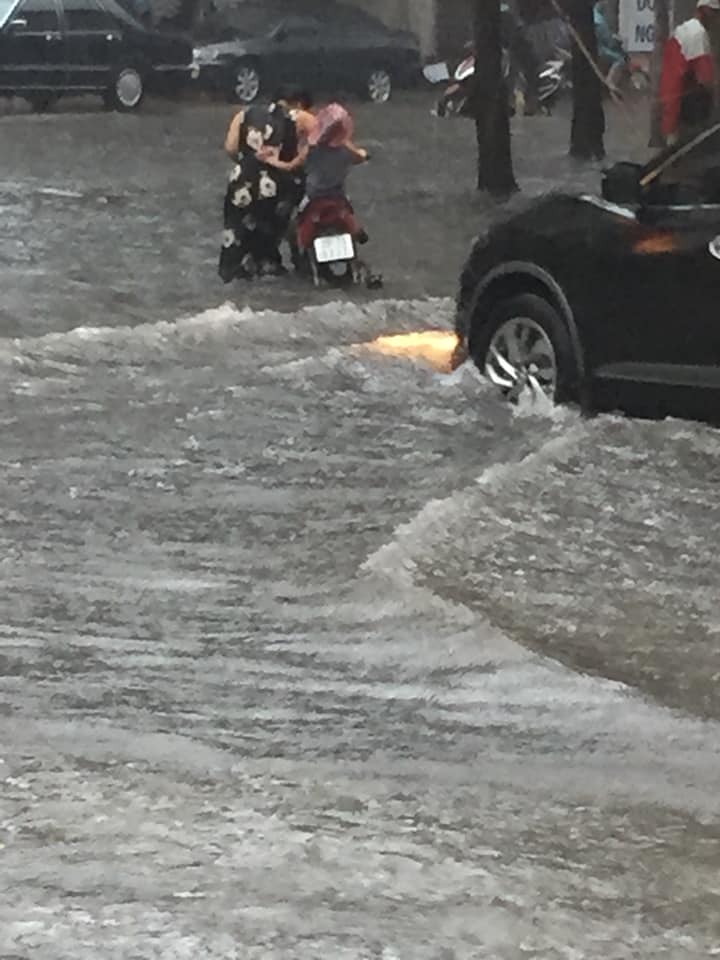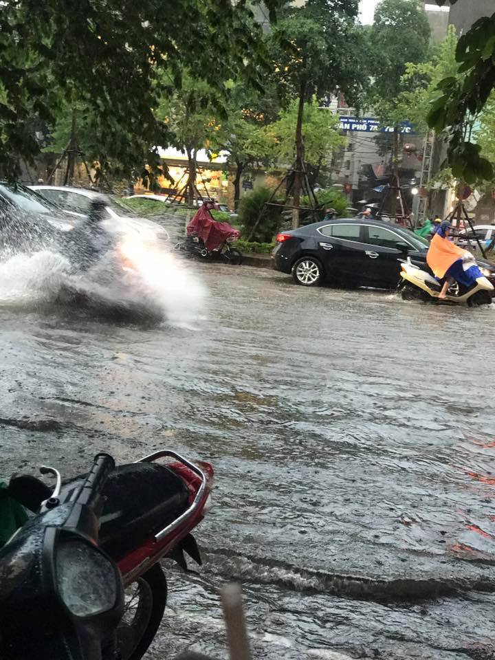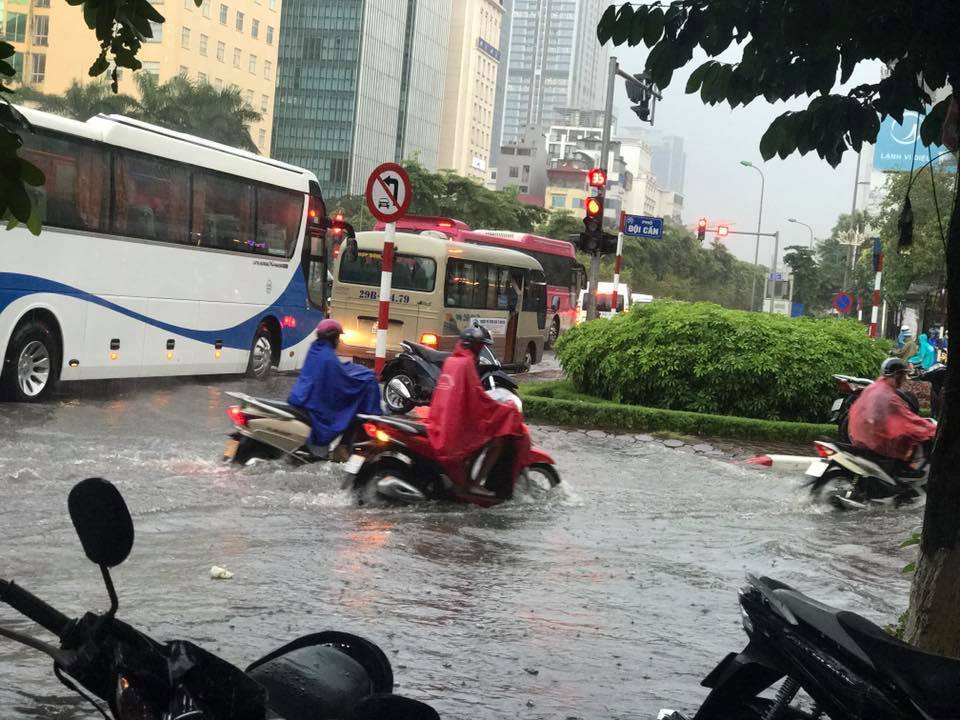 Theo ghi nhận tại ngã tư Văn Cao - Đội Cấn, nước mưa dâng cao ngập quá nửa bánh xe máy khiến nhiều phương tiện di chuyển khó khăn.