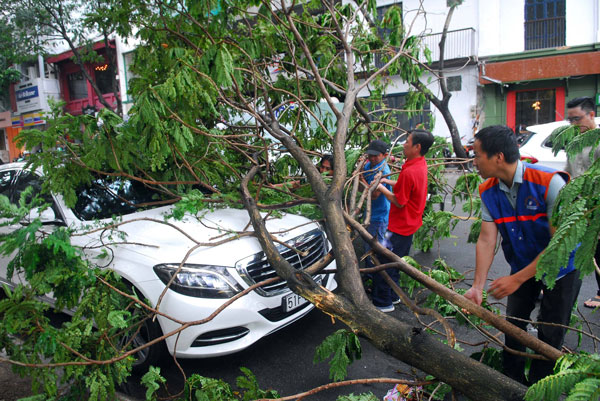 Trận mưa lớn làm một nhánh cây đường kính hơn 20 cm, dài khoảng 7m bị gãy đè lên xe ô tô BKS 51F-506.00 đậu trên đường Mạc Thị Bưởi đoạn gần giao lộ với đường hai Bà Trưng (quận 1). Rất may, thời điểm xảy ra tai nạn không có ai bên trong…