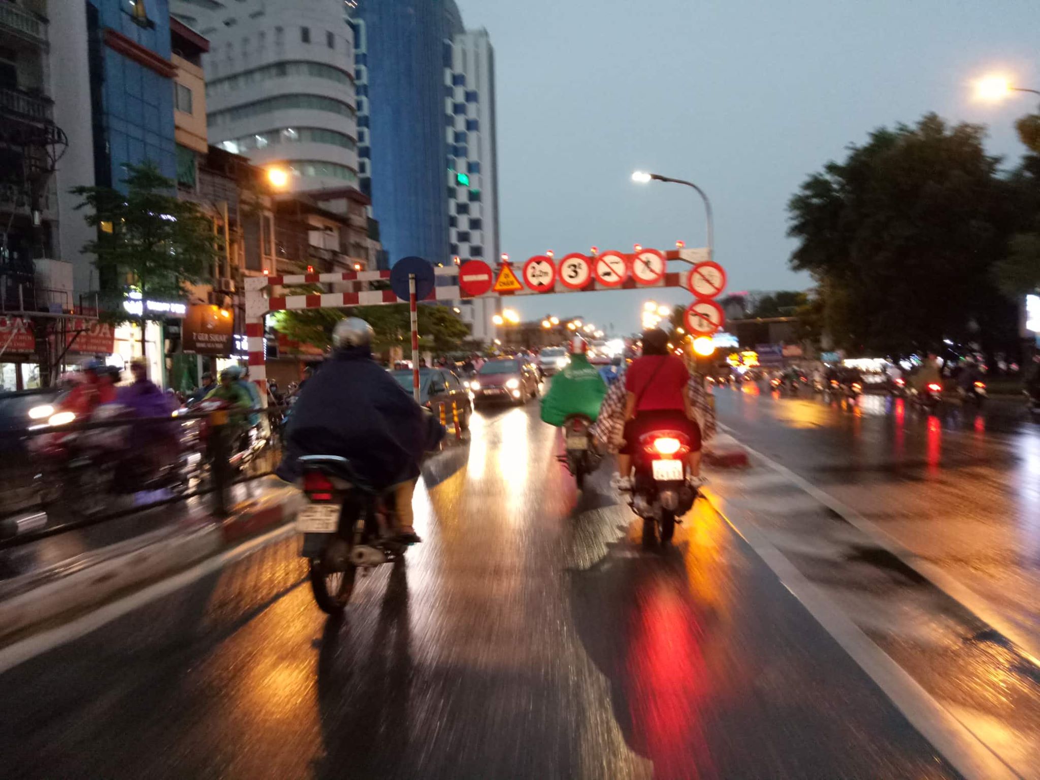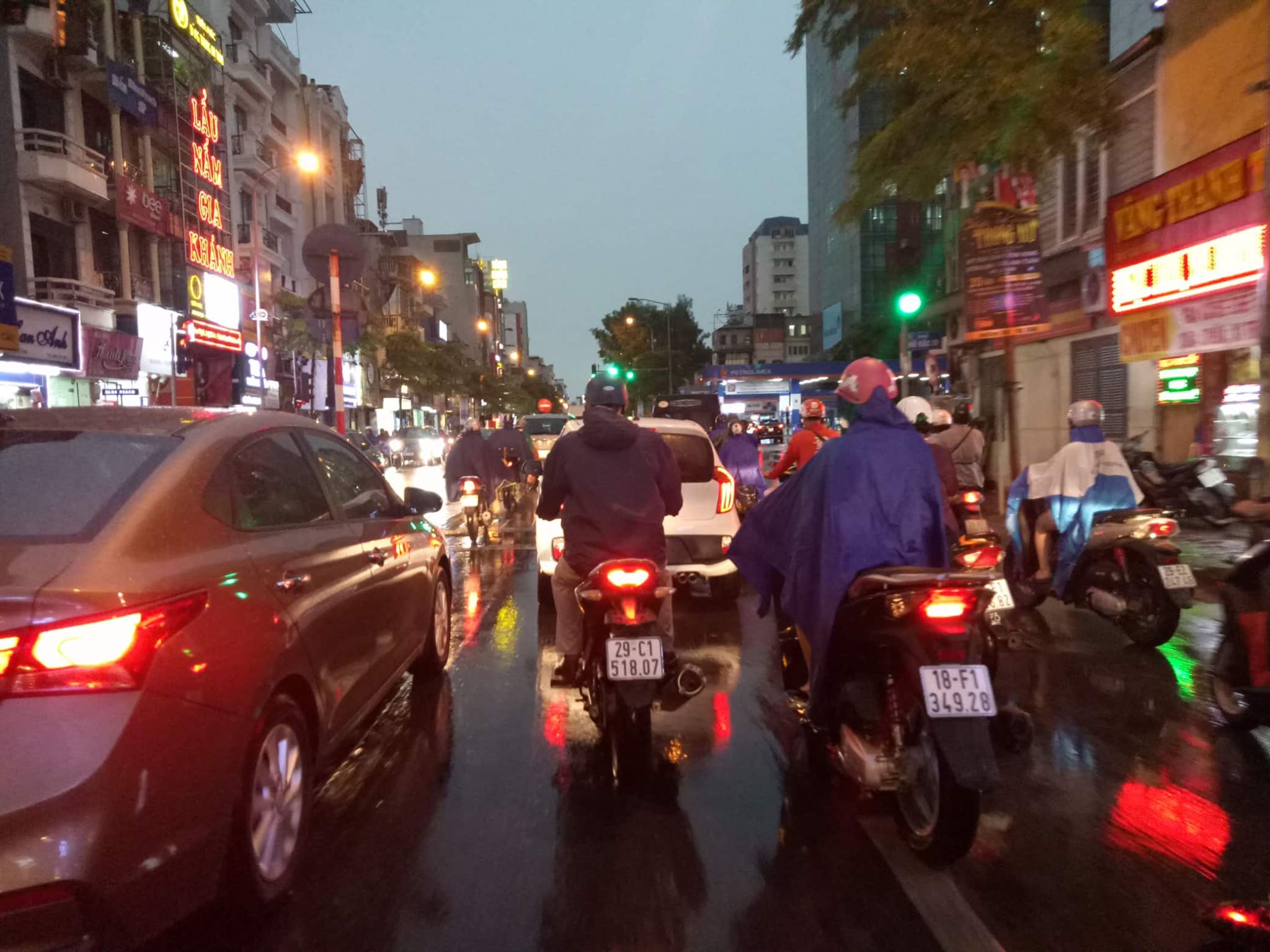 Theo ghi nhận tại đường Nguyễn Trãi, quận Thanh Xuân xuất cơn mưa lớn kèm theo gió, khiến cho nhiều hoạt động kinh doanh cũng như sự di chuyển của người dân hoàn toàn thay đổi.