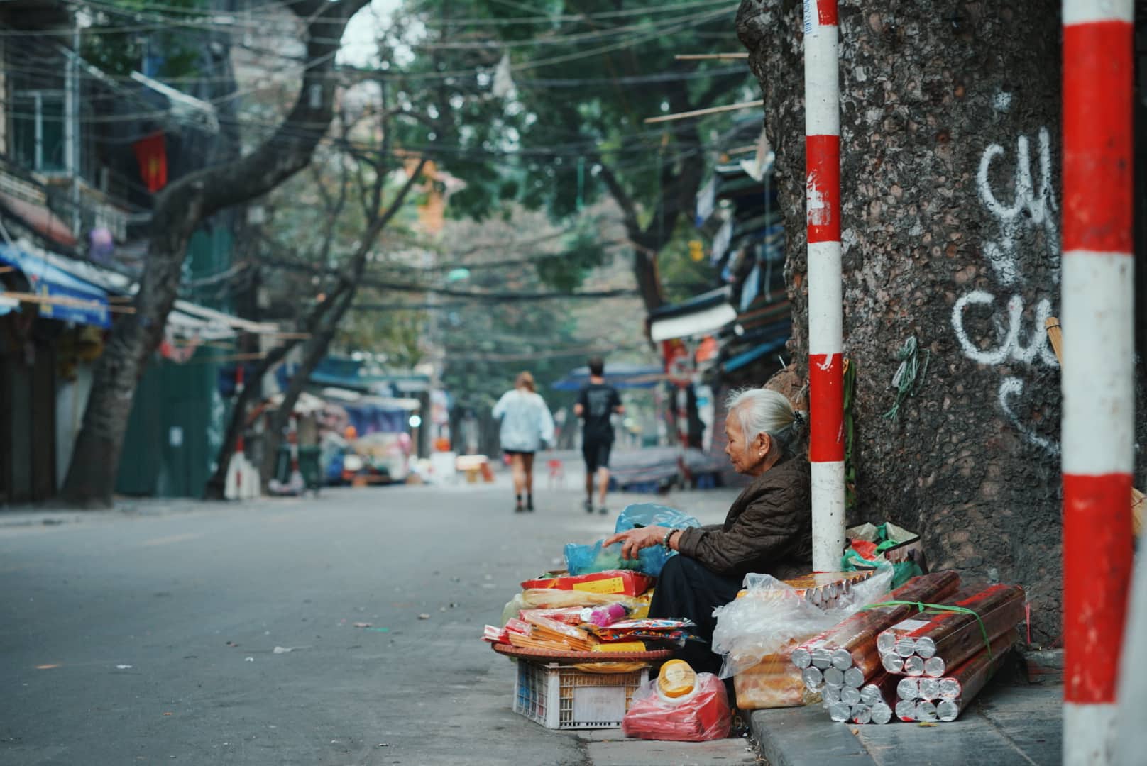 Sáng sớm ngày mùng 1 Tết, quanh con đường vòng vèo ra chợ Đồng Xuân, chỉ còn lác đác vài cụ già thong dong đi trên đường ven hồ Hoàn Kiếm hay trên con phố nhộn nhịp ngày nào giờ chỉ còn bóng dáng quen thuộc của cụ già bên gánh hàng rong…