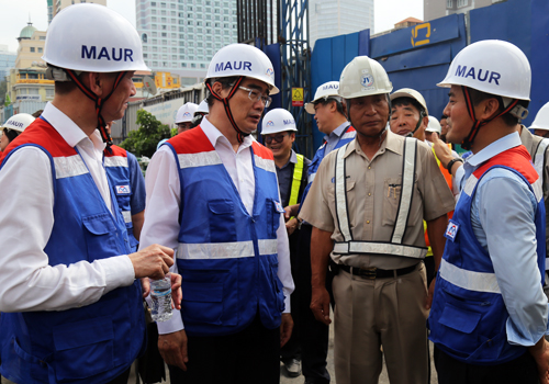 Bí thư Thành ủy TP HCM Nguyễn Thiện Nhân trao đổi với các nhà thầu và lãnh đạo MAUR. Ảnh: Hữu Công.