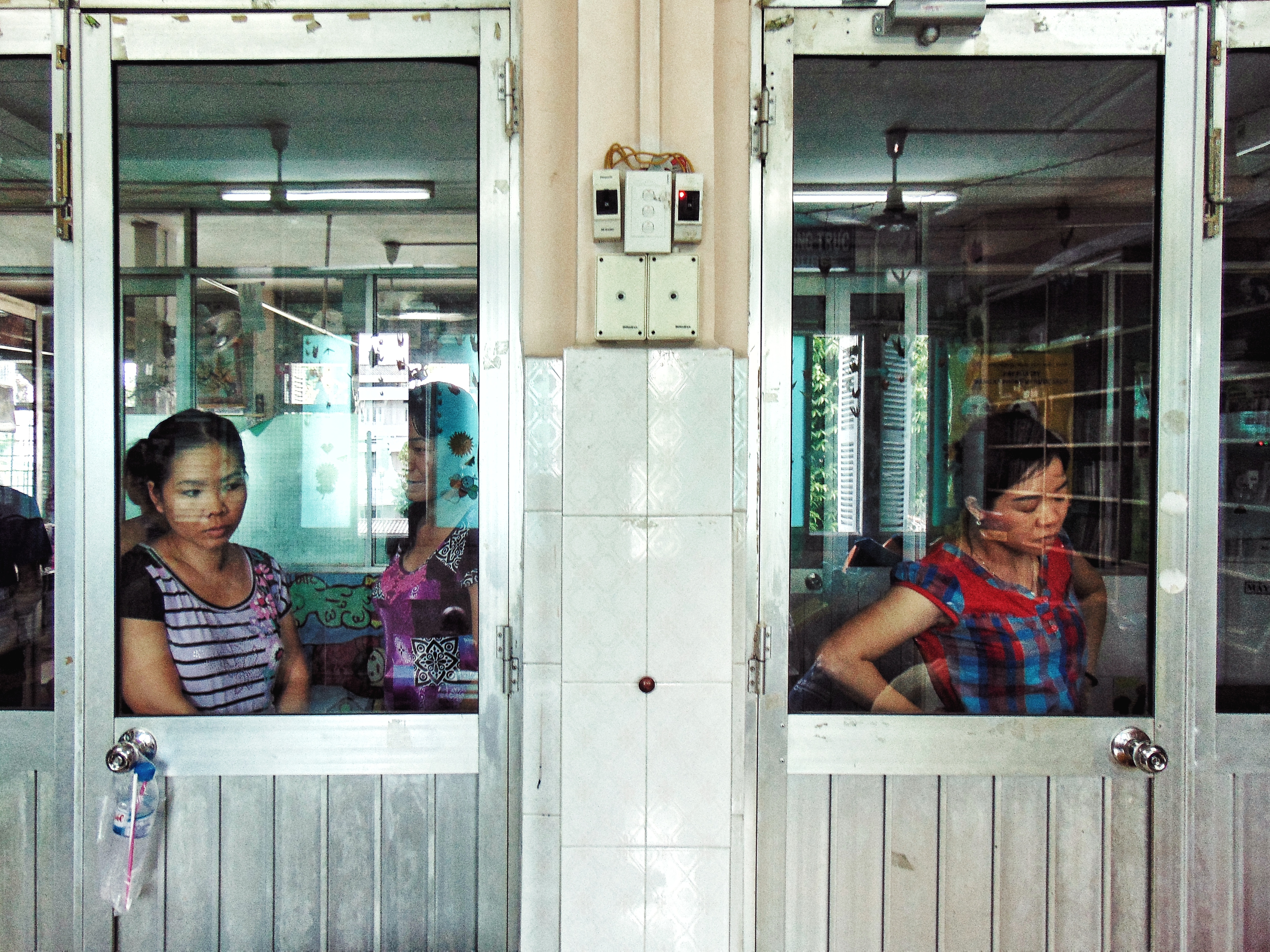 Phụ huynh đứng theo dõi con mình tham gia lớp học từ bên ngoài.