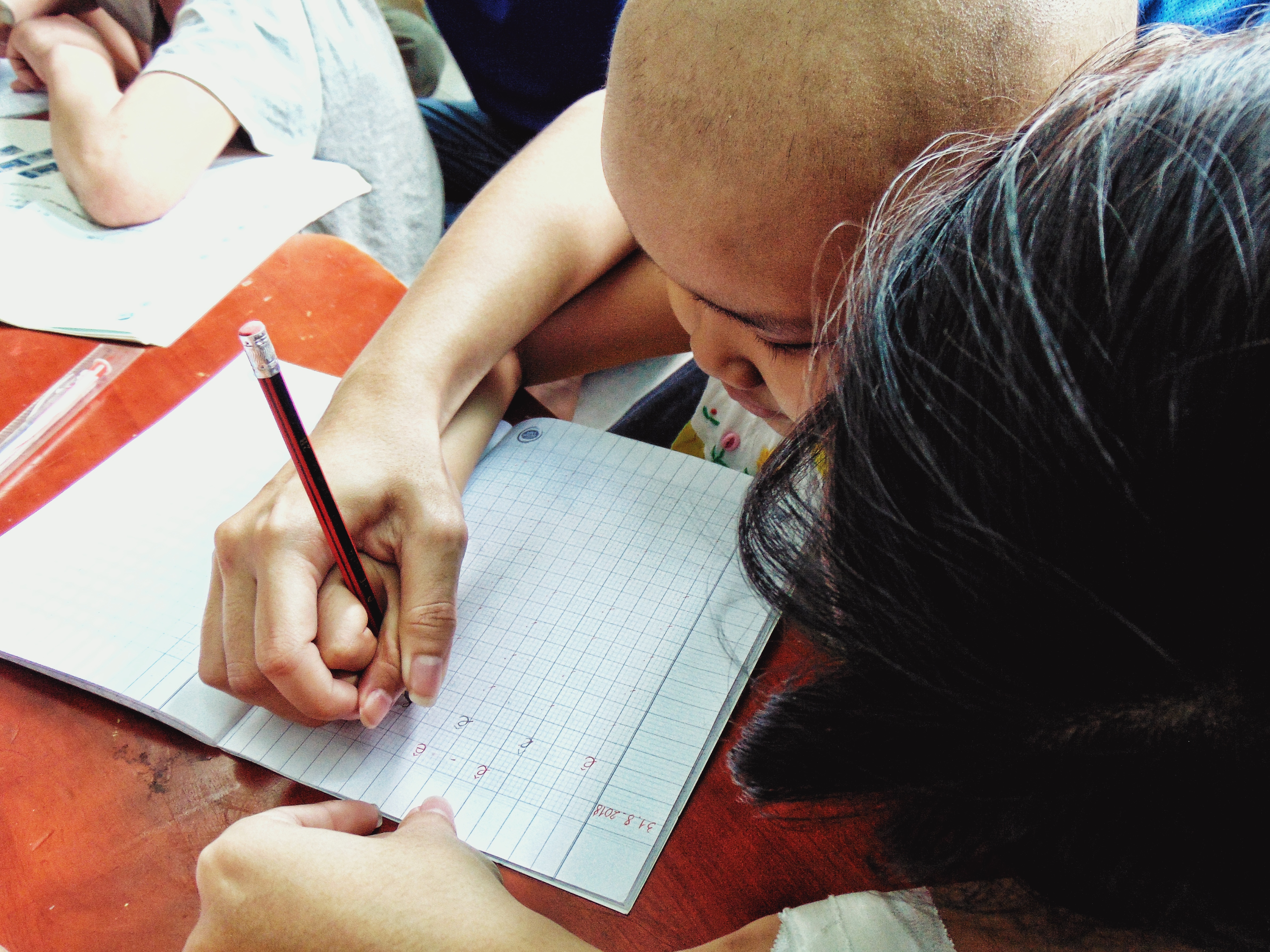Cầm tay một bé gái đã từ lâu không được sở hữu mái tóc dài, cô giáo Loan nắn nót từng nét chữ để giúp em viết đẹp các chữ cái. Chữ “k” với các nét cong xiên phức tạp, khiến đôi tay nhỏ của cô bé mỏi mệt. Người giáo viên kiên nhẫn dõi theo từng nét chữ và động viên mỗi khi học trò của mình có ý định bỏ cuộc.