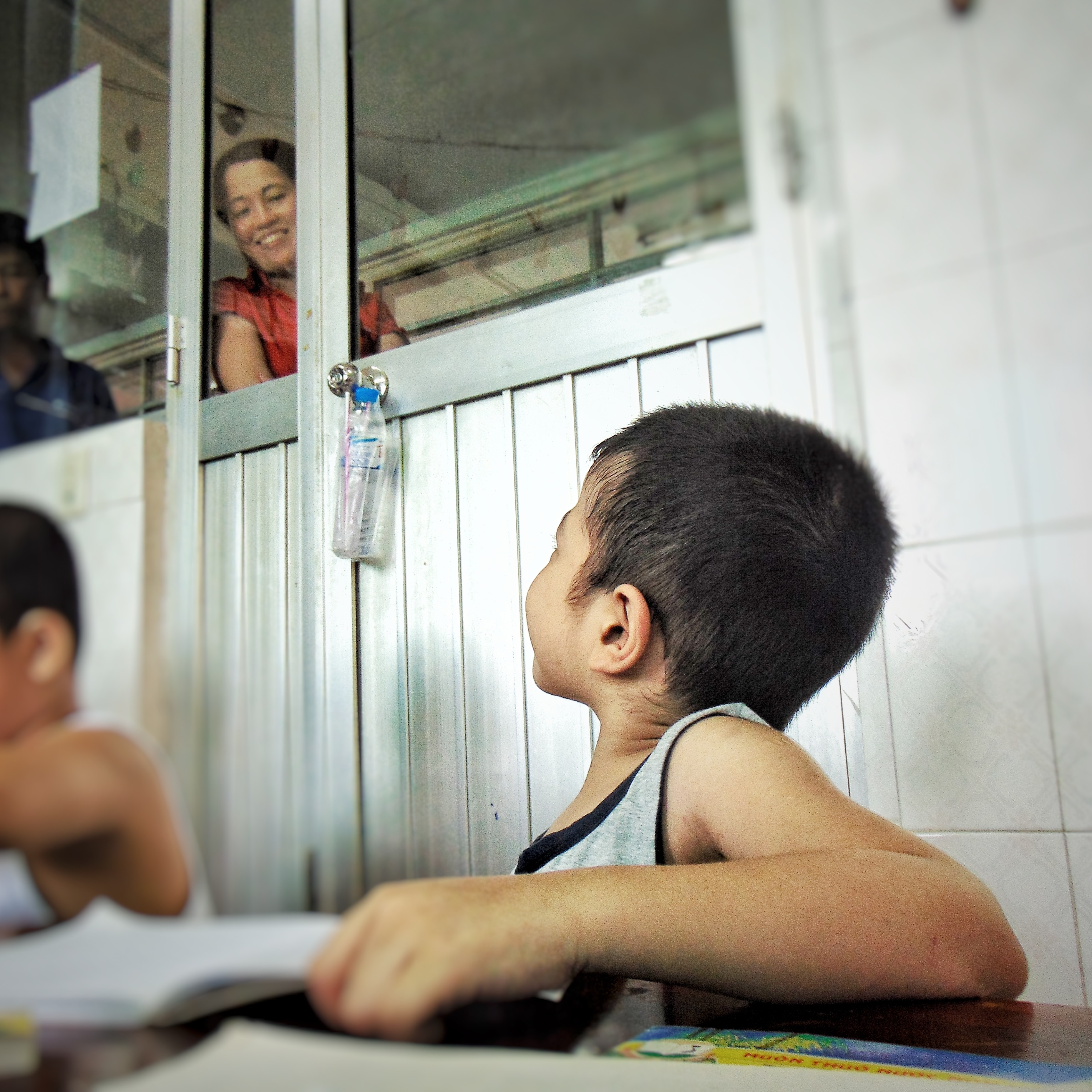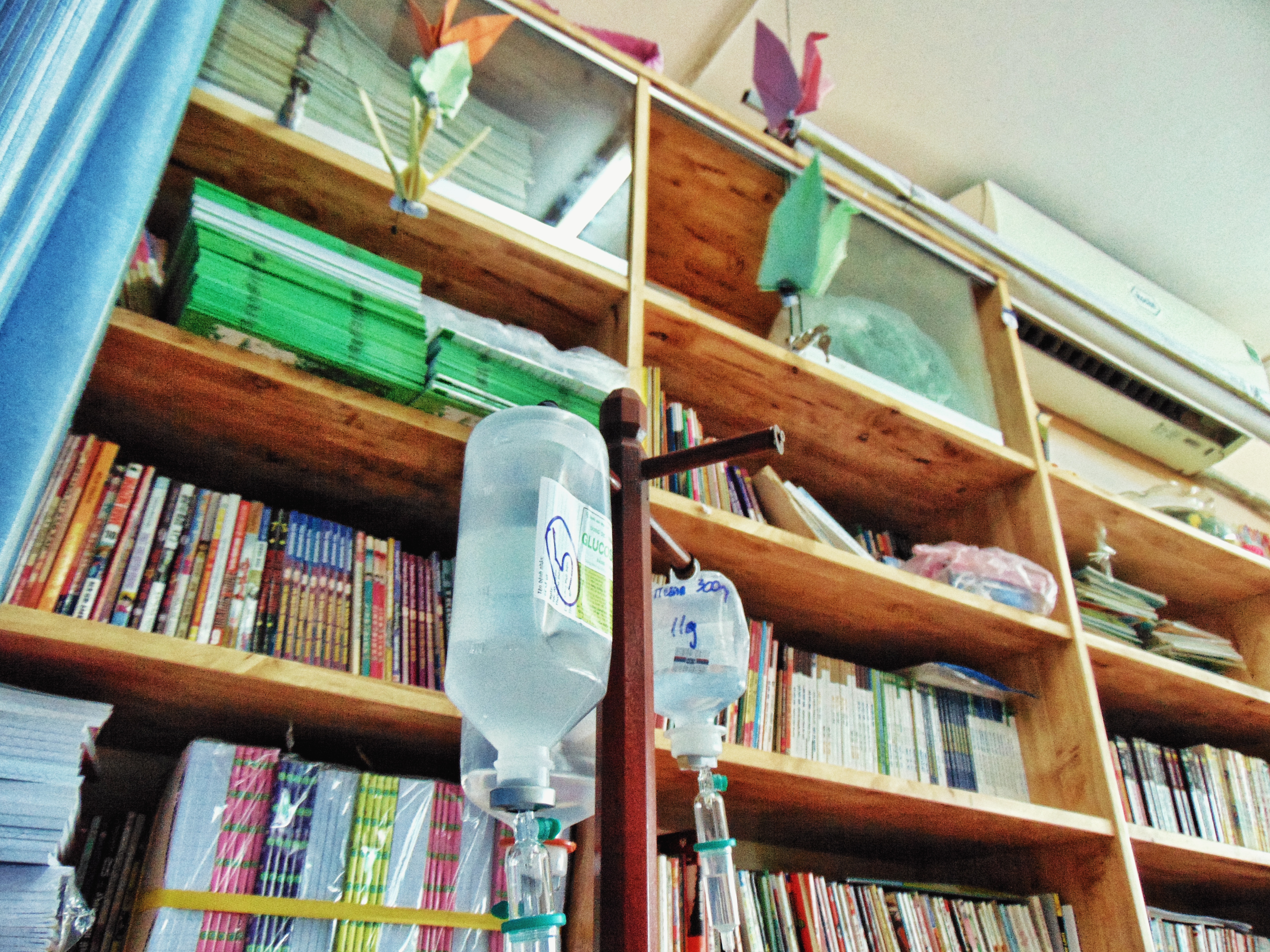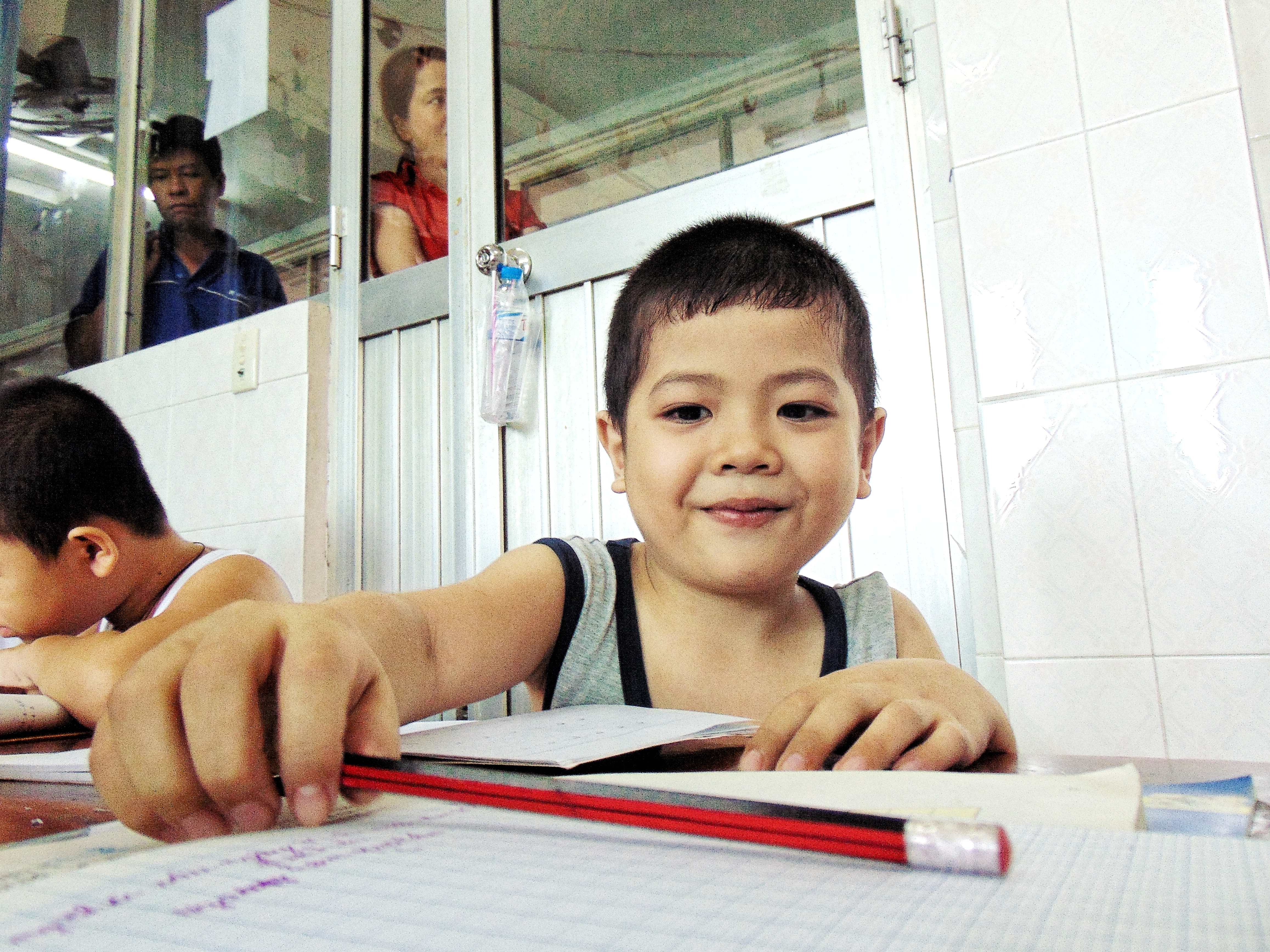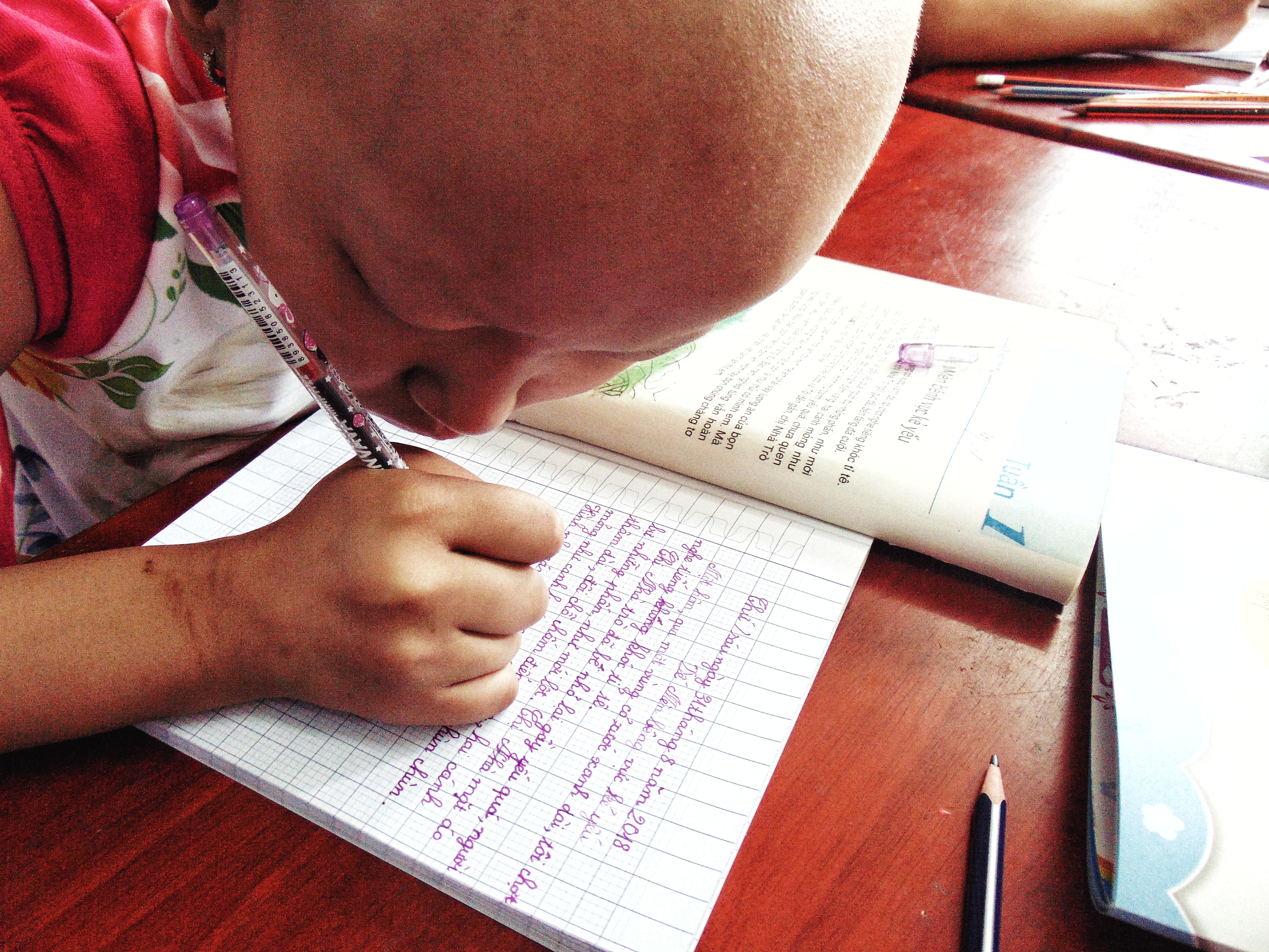 Có em còn khỏe thì tự đến lớp, có em sức khỏe yếu được cha mẹ cõng đến. Ngồi học trong lớp, tay phải cầm bút còn tay trái thì được tiêm truyền dịch, ống dẫn dịch và bình truyền dịch treo lủng lẳng ngay bên cạnh. Nét mặt xanh xao hốc hác vì bệnh tật, nhưng nụ cười hồn nhiên không bao giờ tắt.