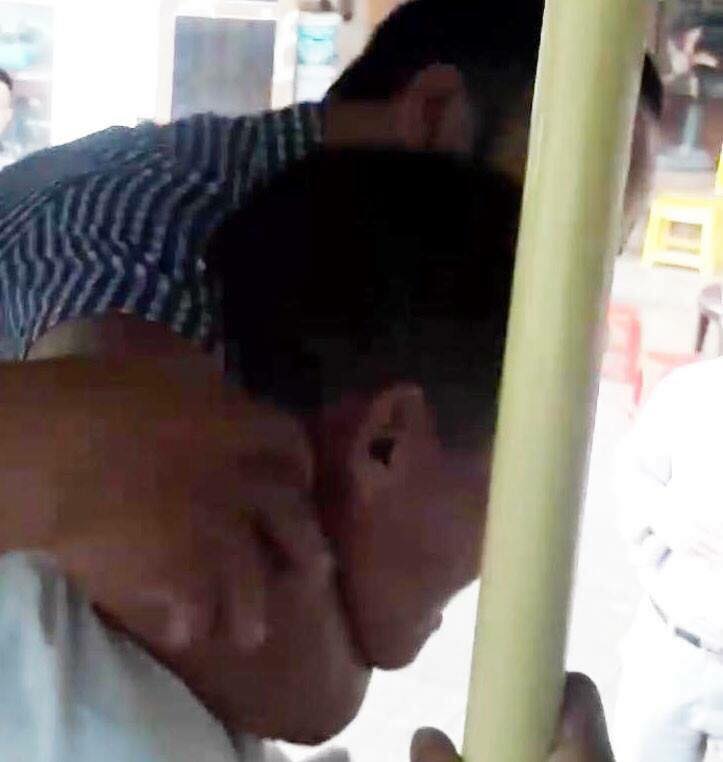 Nhân viên bán vé xe buýt (áo ca rô) kẹp cổ hành khách. Ảnh cắt từ clip.