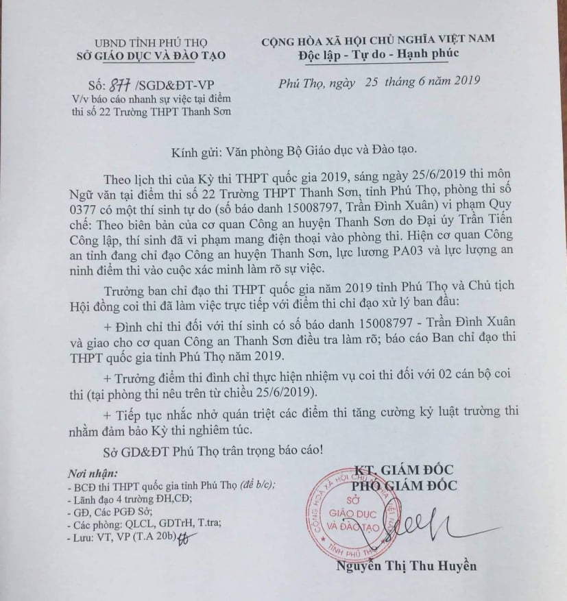 Căn cứ tính chất, mức độ của nội dung vụ việc, Công an tỉnh Phú Thọ đã tham mưu cho Ban chỉ đạo thi THPT Quốc gia tỉnh Phú Thọ tiến hành đình chỉ thi đối với thí sinh Trần Đình Xuân và 2 giám thị coi thi là Phí Thị Mai Linh, giáo viên Trường THPT Minh Hòa, huyện Yên Lập, tỉnh Phú Thọ và Nguyễn Văn Huyên, giảng viên Học viện Ngoại giao.
