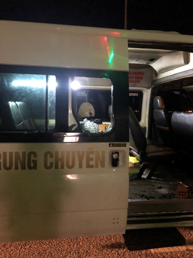 Xe khách bị ném đá, đập phá khiến 2 người bị thương. Ảnh: Văn Tiến/Thanh Niên