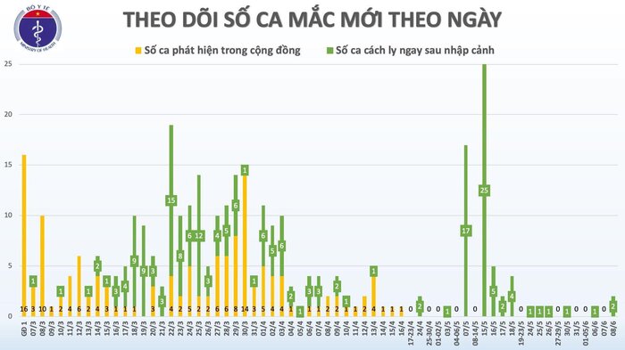 – Tính từ 18h ngày 7/6 đến 6h ngày 8/6: 2 ca mắc mới.