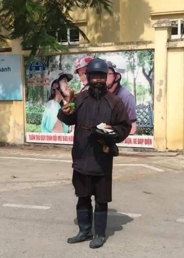 Vài ngày qua, mạng xã hội xôn xao trước những hình ảnh về người đàn ông ăn xin với dáng vẻ quái dị như: đi ủng, mặc quần áo đen, đội mũ bảo hiểm, bôi đen mặt, tay cầm đầu gà, xúc xích… cầm khay đi ăn xin tại nhiều địa điểm ở Hà Nội cùng một số tỉnh thành khác.
