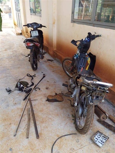 Xe máy của nhóm đối tượng trộm chó bị dân làng thu giữ. Ảnh: Tổ Quốc