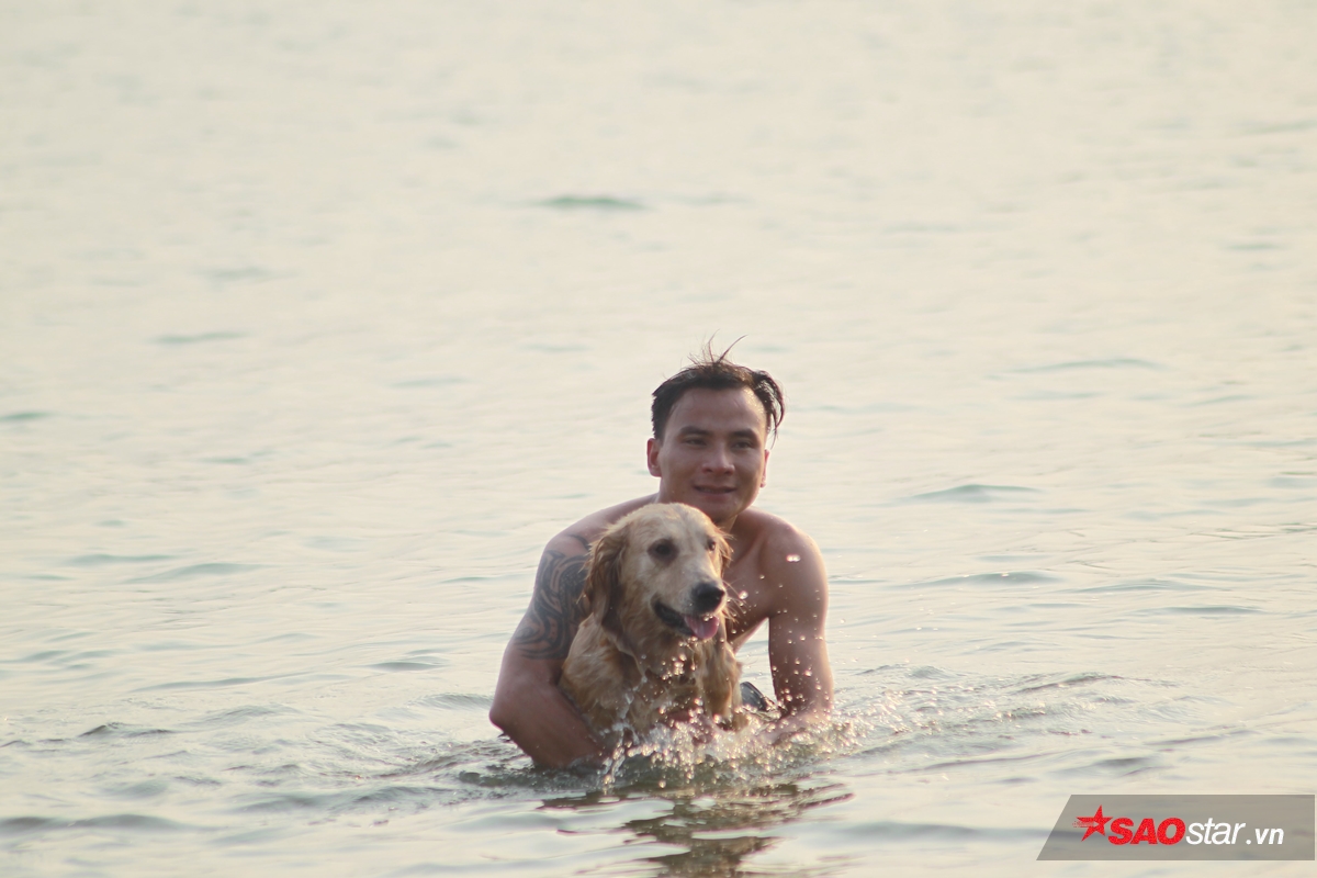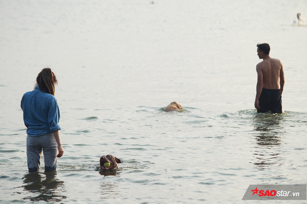 Dòng nước mát cộng thêm không gian rộng rãi, thoáng đãng, cảnh sắc đẹp ở hồ Tây chính là điểm cộng thu hút mọi người. Đáng nói hơn, ngoài dẫn theo cả gia đình cùng đi tắm, nhiều người còn mang cả thú cưng đến đây để… dạy bơi. Điều này khiến khung cảnh ở hồ Tây càng đông vui, tấp nập hơn.