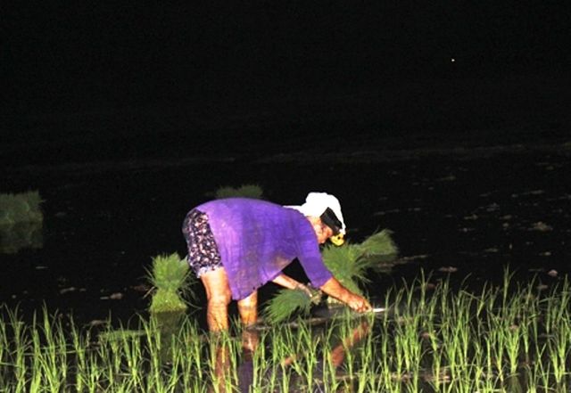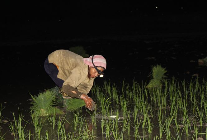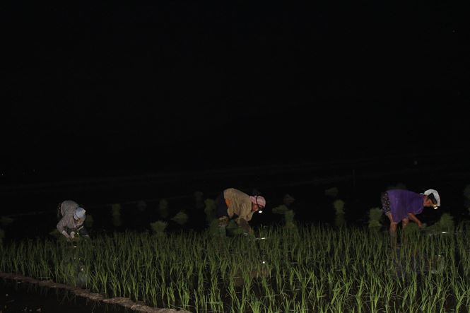 Người dân đi cấy lúa đêm. Ảnh: Tiền Phong