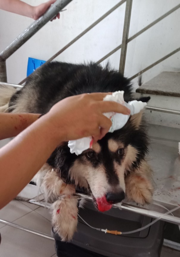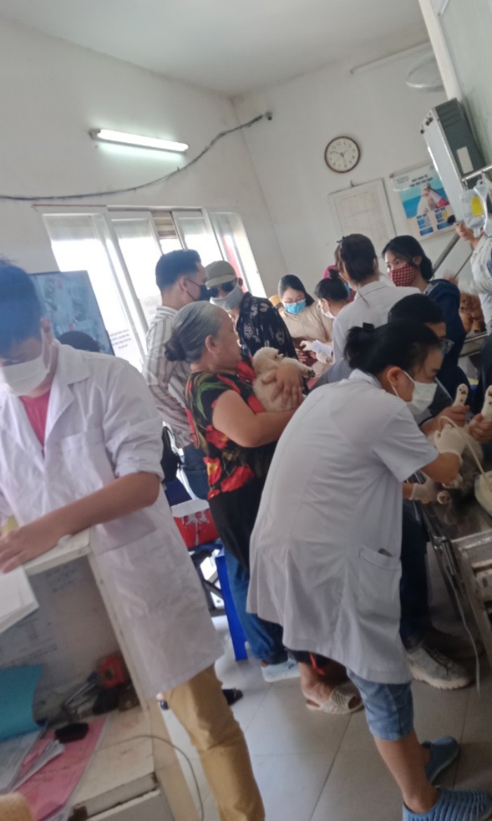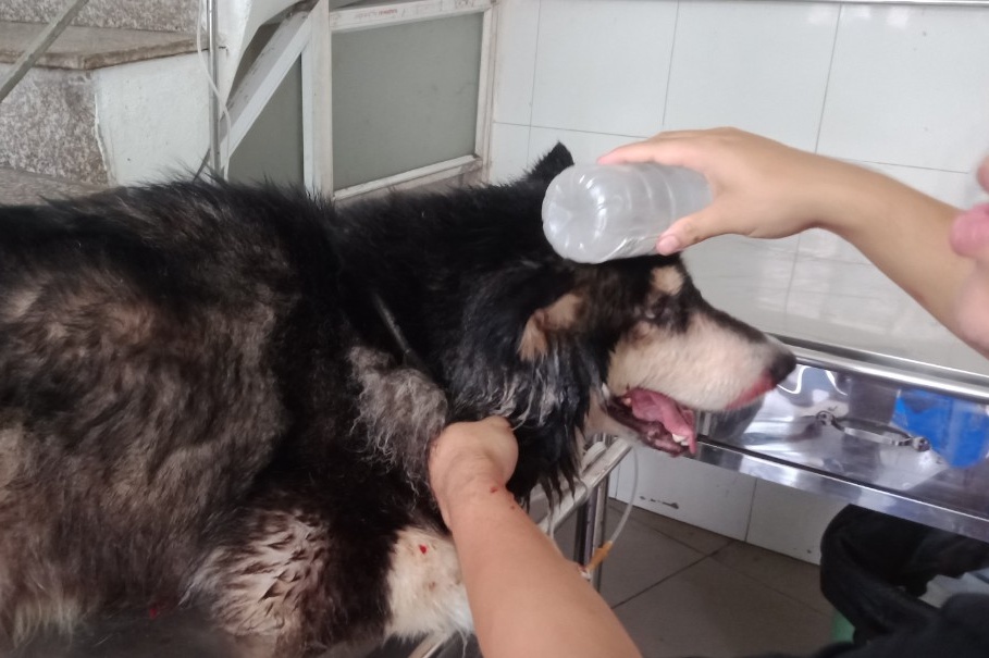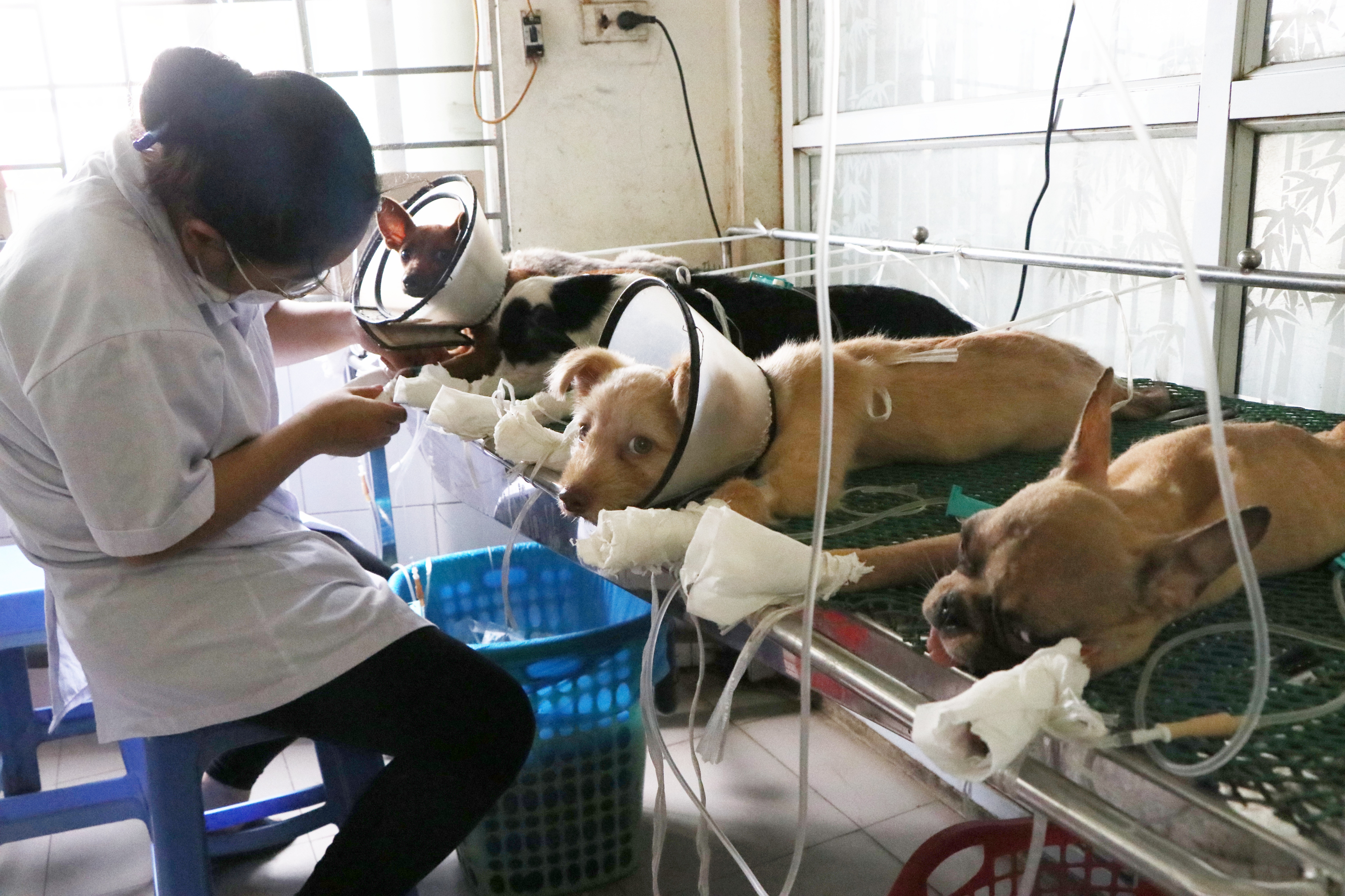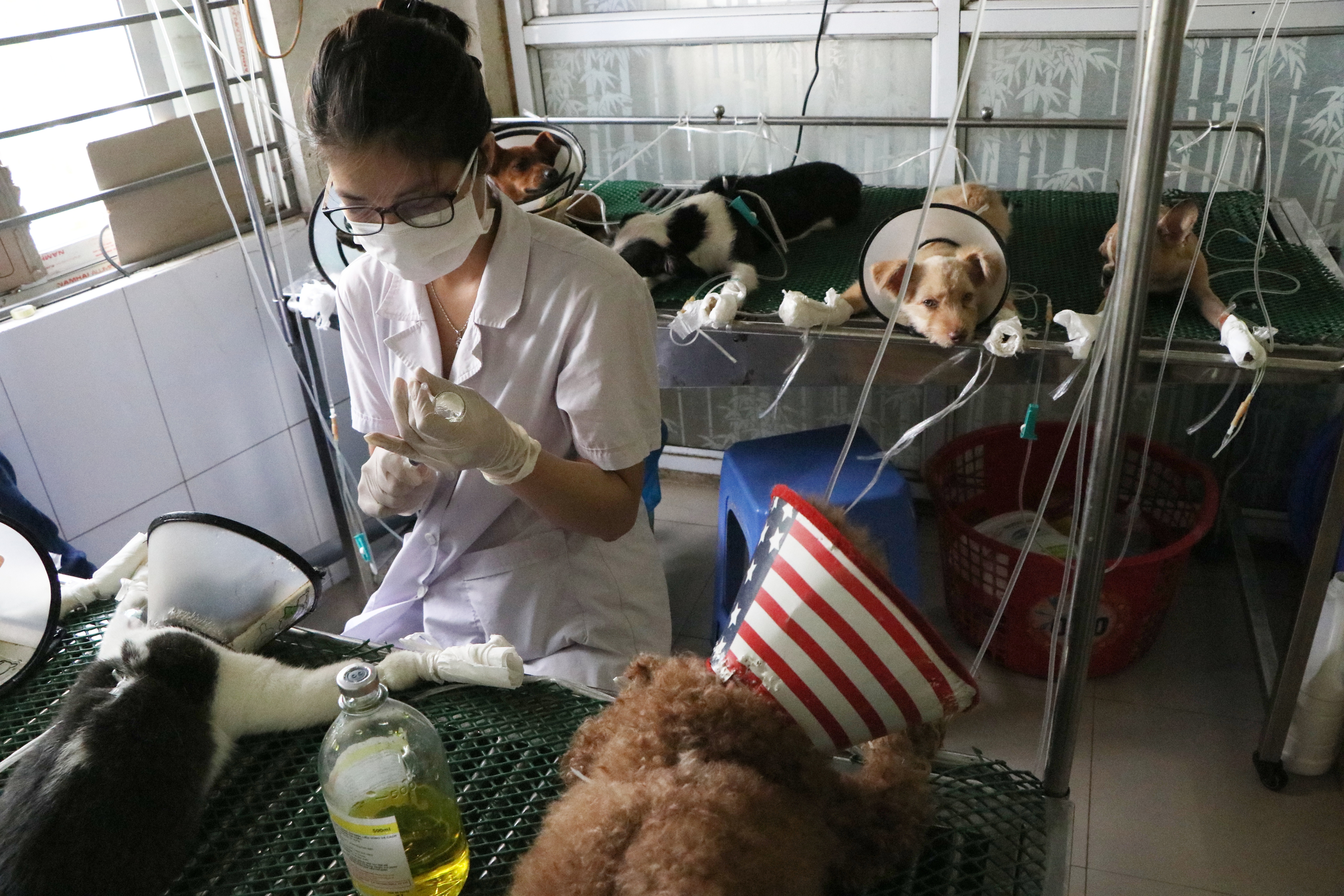 Tiếp nhận một chú chó Alaska liên tục chảy máu mũi, bà Phạm Thị Lan Hương, quản lý Bệnh viện Thú y cùng đội ngũ nhân viên vội vã khám rồi chườm đá làm mát cơ thể. Chú chó này sau đó được bác sĩ thú y vệ sinh thân thể đưa đi truyền nước.