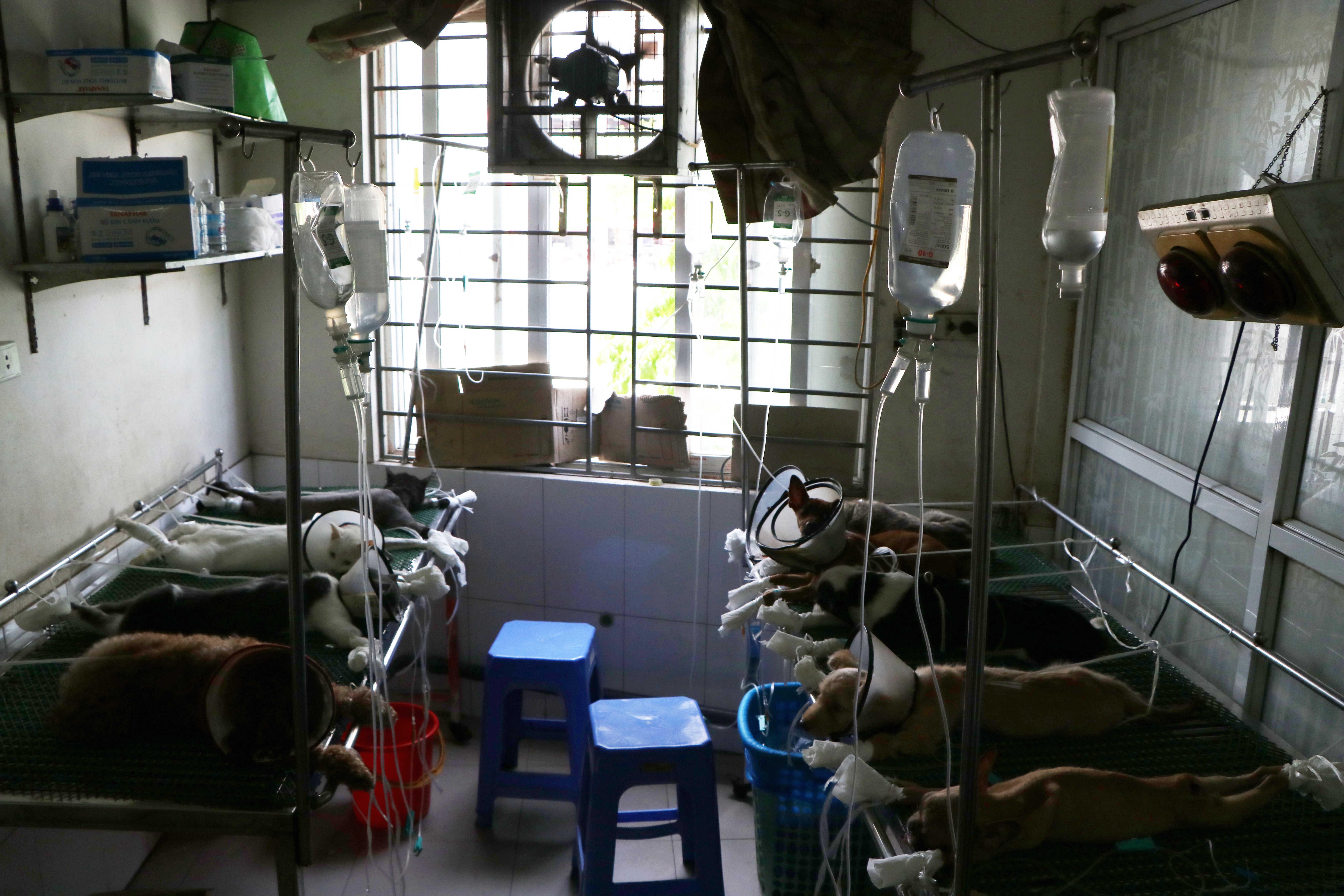 Các triệu chứng dễ thấy là vật nuôi thở dốc, thân nhiệt cao, chảy máu mũi, tứ chi co cứng, co giật… Vật nuôi sẽ được truyền nước và đường để hạ sốt, tránh mất nước. Mỗi bình truyền cùng lúc cho nhiều con vật. Để giữ an toàn, y tá phải cố định tứ chi vật nuôi để tránh bị cắn, cào khi tiếp xúc.