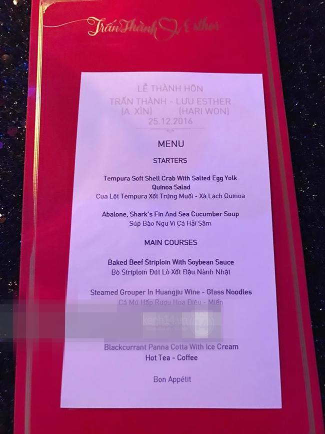 Tối ngày 25/12, lễ cưới của cặp đôi đình đám nhất Vbiz hiện nay Trấn Thành - Hari Won đã diễn ra tại một trong những trung tâm tiệc cưới có tiếng nhất tại TP Hồ Chí Minh. Lễ cưới được tổ chức sang trọng, hoành tráng với sự góp mặt của khoảng 300 khách mời là bạn bè thân thiết của cặp đôi trong showbiz. Có lẽ vì thế mà thực đơn các món ăn trong bữa tiệc cưới cũng được Trấn Thành và Hari Won chuẩn bị hết sức chu đáo.