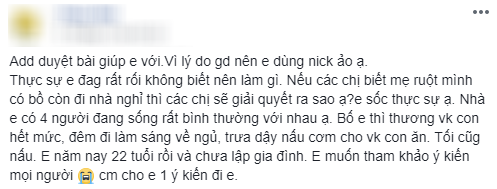“Thực sự em đang rất rối không biết nên làm gì. Nếu các chị biết mẹ ruột mình có bồ còn đi nhà nghỉ thì các chị sẽ giải quyết ra sao ạ? Em sốc thực sự ạ. Nhà em có 4 người đang sống rất bình thường với nhau ạ. Bố em thì thương vợ con hết mức, đêm đi làm sáng về ngủ, trưa dậy nấu cơm cho vợ con ăn. Tối cũng nấu. Em năm nay 22 tuổi rồi và chưa lập gia đình. Em muốn tham khảo ý kiến mọi người, các mẹ cho em 1 ý kiến đi”.