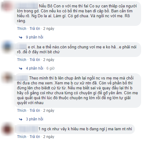 Gần như đồng tình với ý kiến trên, chị gái Ly NT cũng chia sẻ: “Theo mình thì bạn nên chụp ảnh lại ngồi nói chuyện với mẹ xem sao. Mẹ mà chối thì đưa cho mẹ xem. Xem mẹ bạn cư xử như thế nào đã. Còn về phần bố thì đừng nên cho bố biết, cứ từ từ. Nếu mẹ biết sai và quay đầu lại thì bạn hãy cố gắng coi như chưa từng có chuyện gì để gia đình yên ấm. Còn mẹ quá quắt quá thì lúc đó thuộc chuyện người lớn rồi để người lớn tự giải quyết với nhau”.