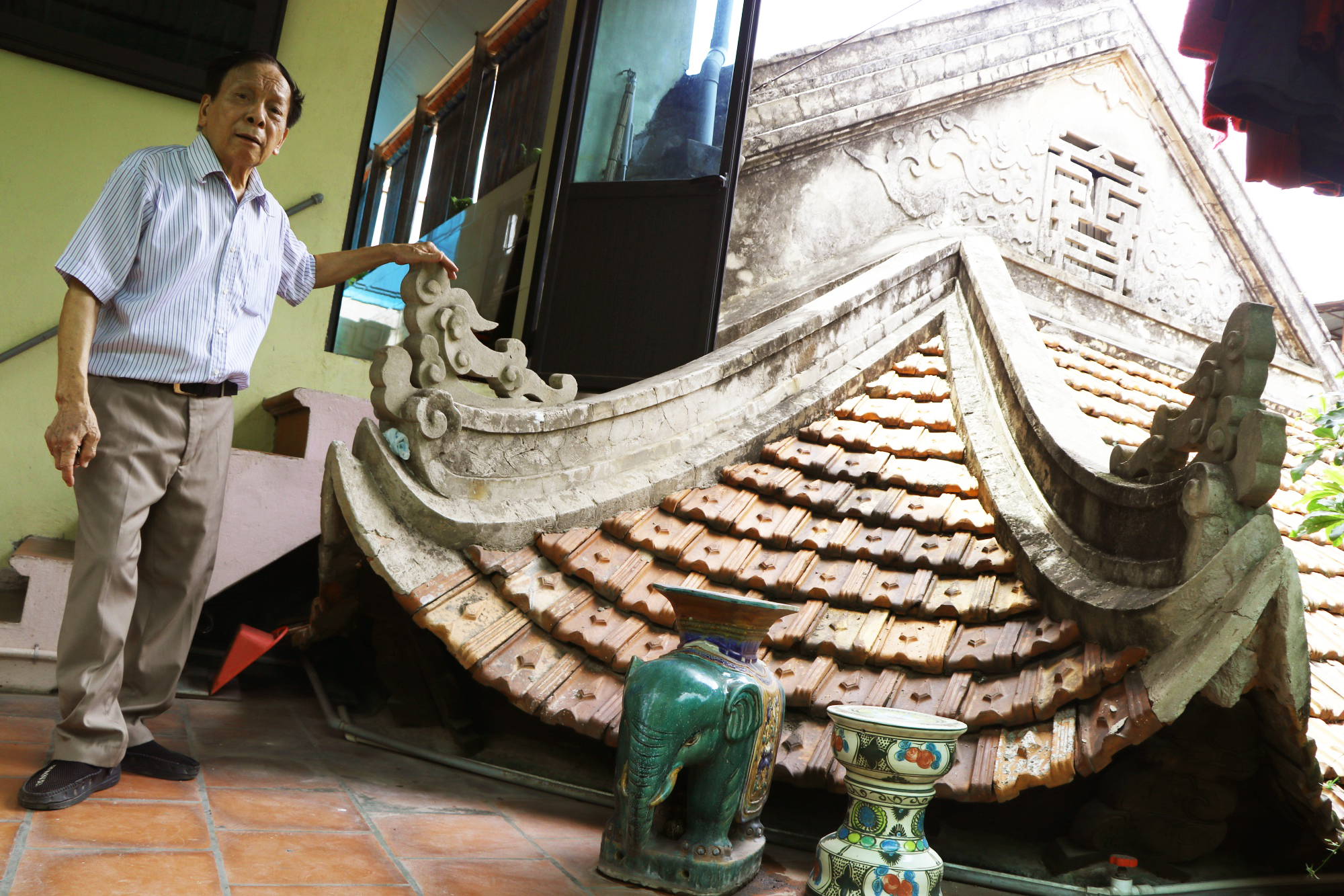 Do mảnh đất không vuông vức nên ông nội ông cùng nhà thiết kế đã sáng tạo ra một góc mái ngói có tới hai đầu giao để khắc phục khiếm khuyết.