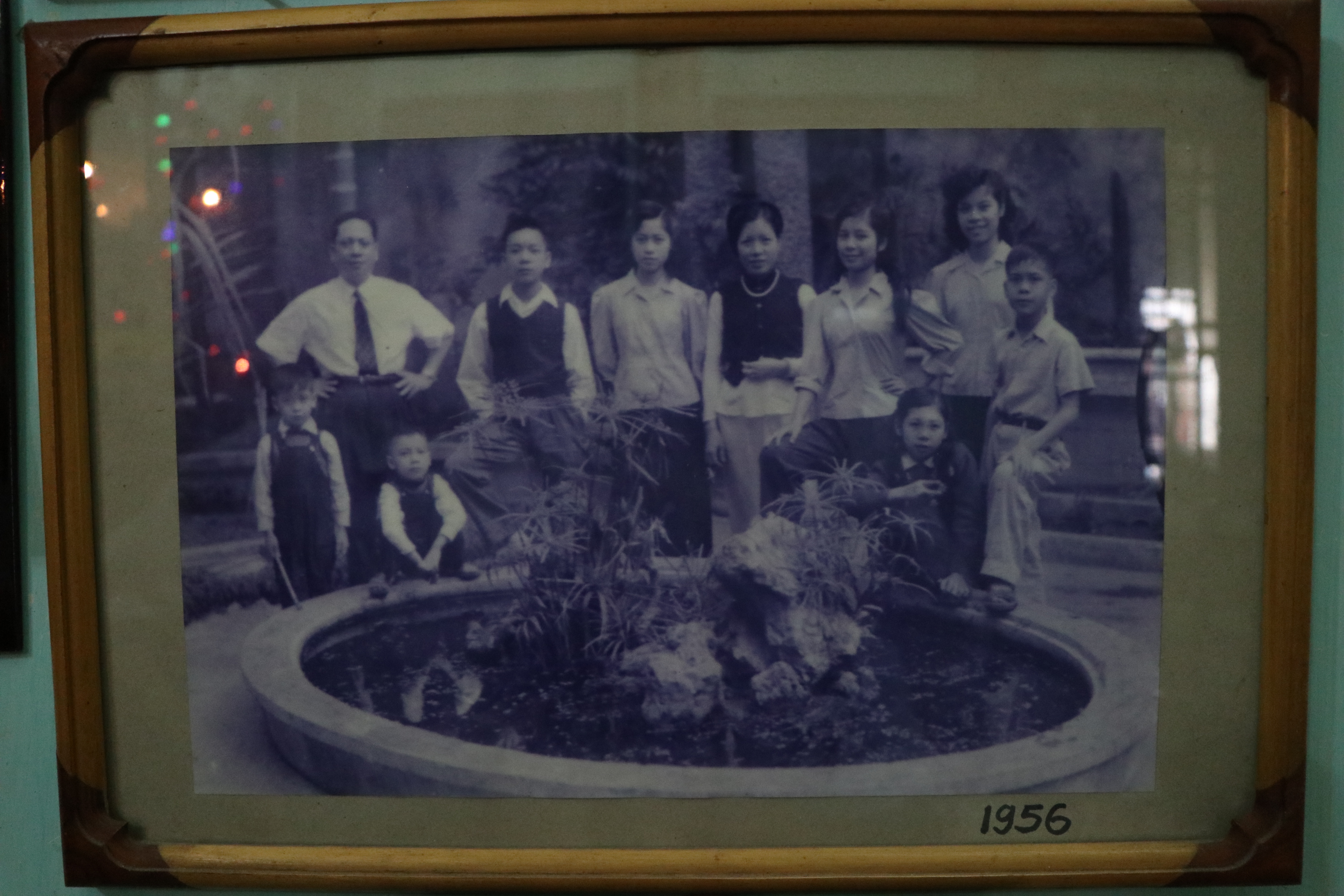 Vợ chồng cụ Thanh bên các con chụp bên hòn non bộ hiện vẫn còn gìn giữ.