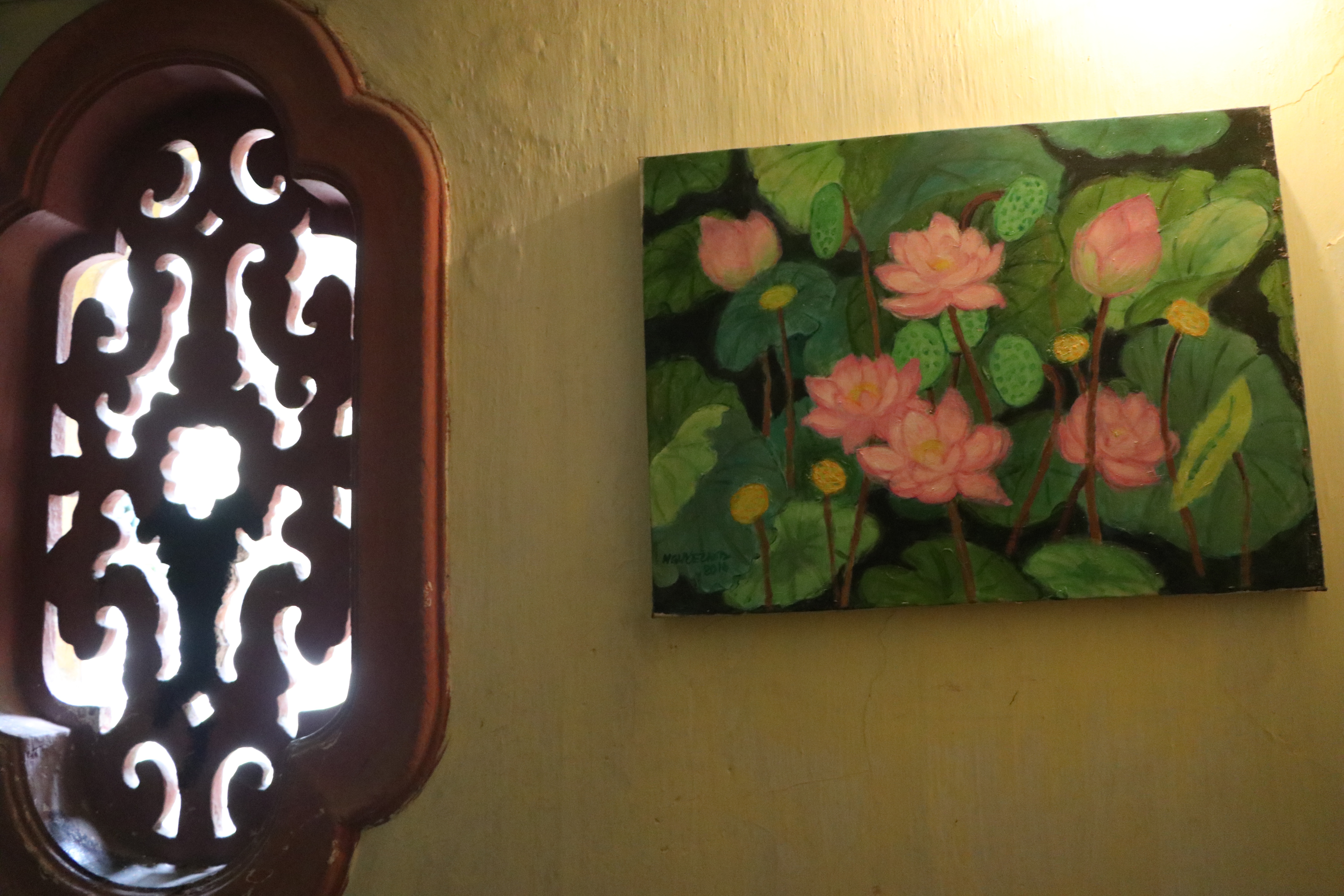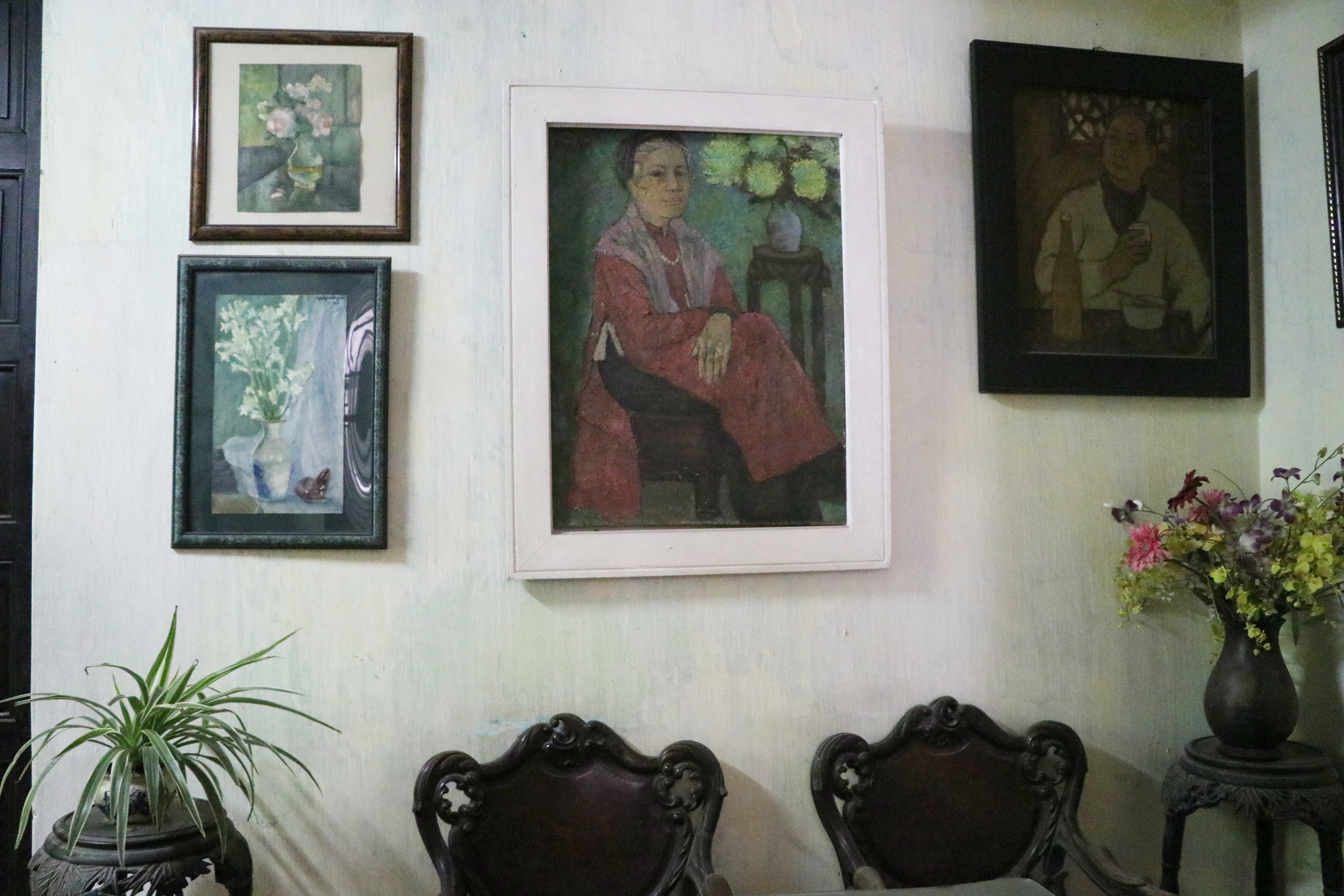 Các bức hoạ do chính tay chị gái ông Giao vẽ treo trên tường.