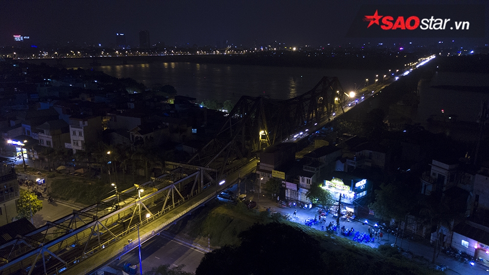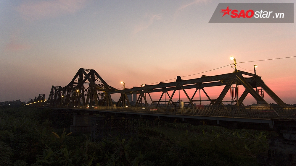 Cầu Long Biên ở góc chụp rộng toàn cảnh, phía xa xa là cầu Chương Dương.