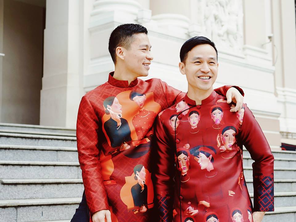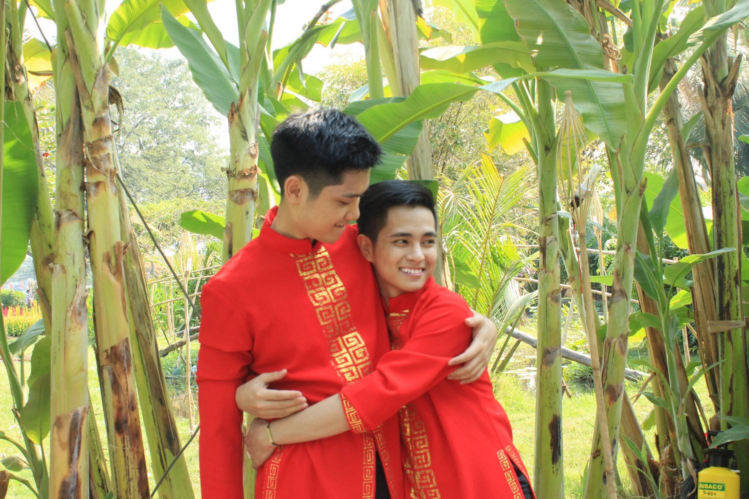 2 anh chàng Nguyễn Hoàng Quân và Thái Bình Dương diện áo dài đỏ trong ngày Tết.