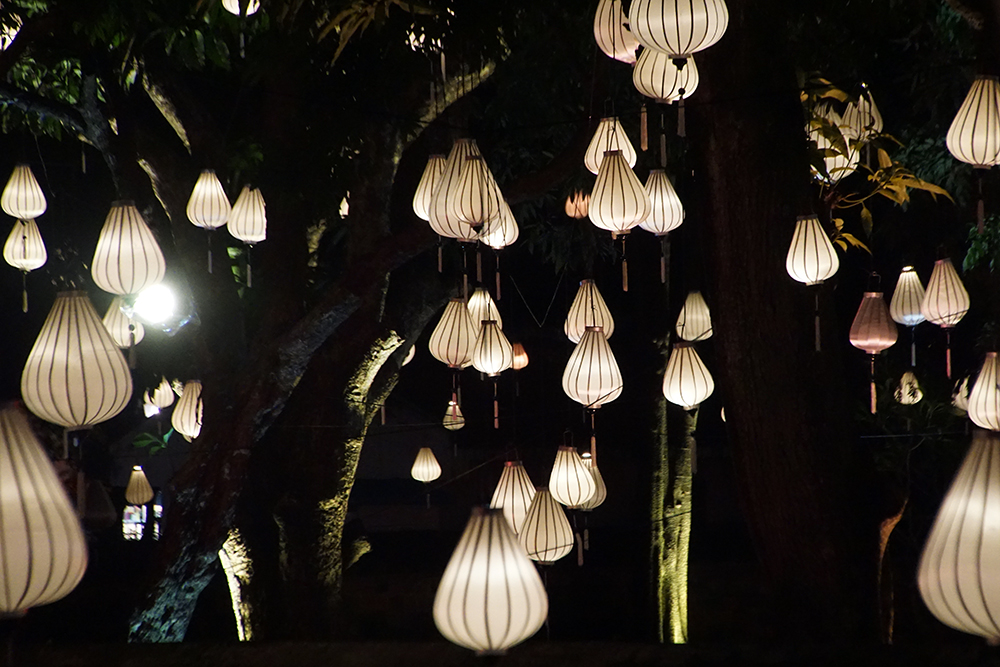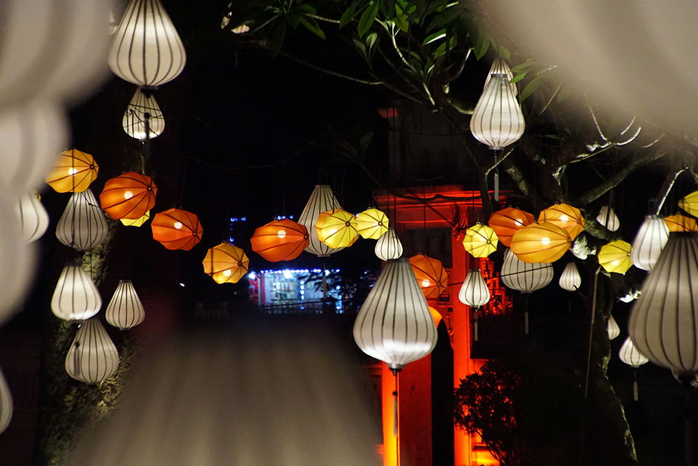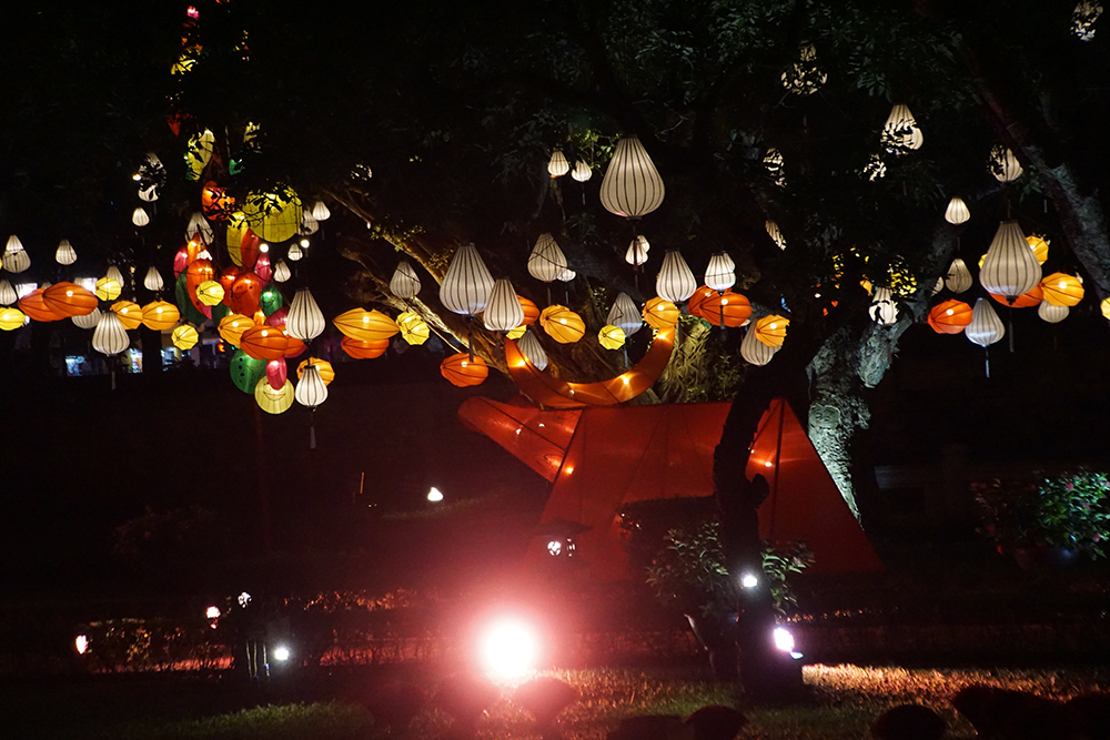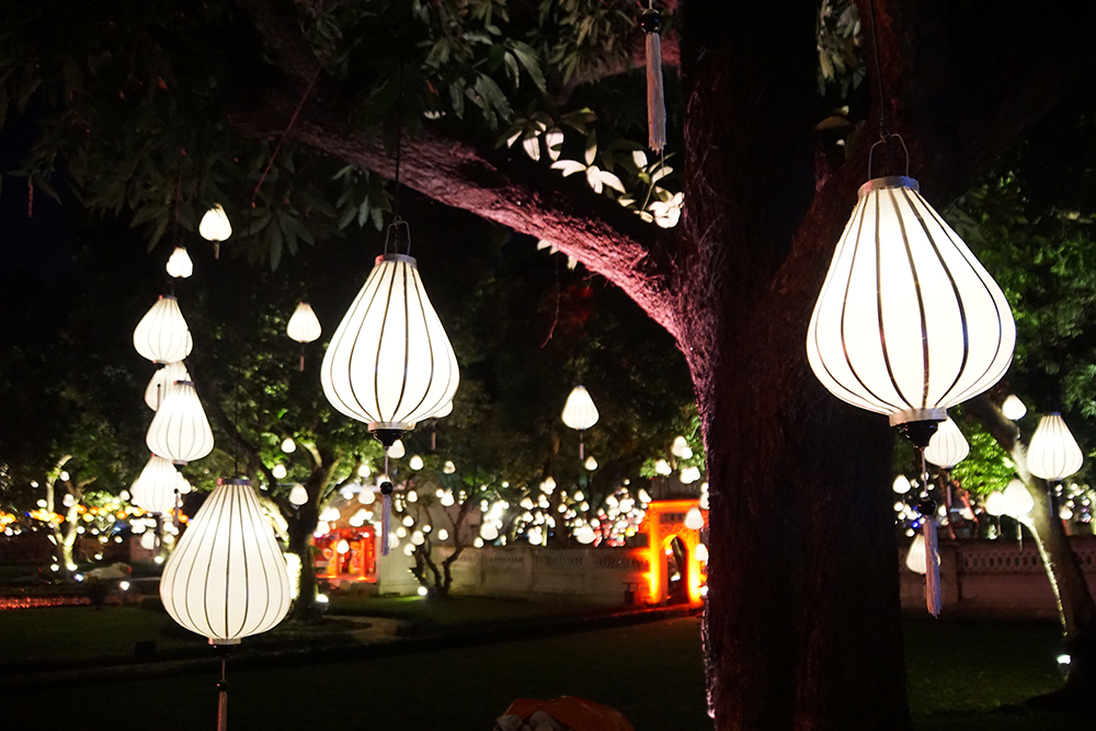 Những chiếc đèn lồng rực sáng quanh thân cây ở khuôn viên Văn Miếu.