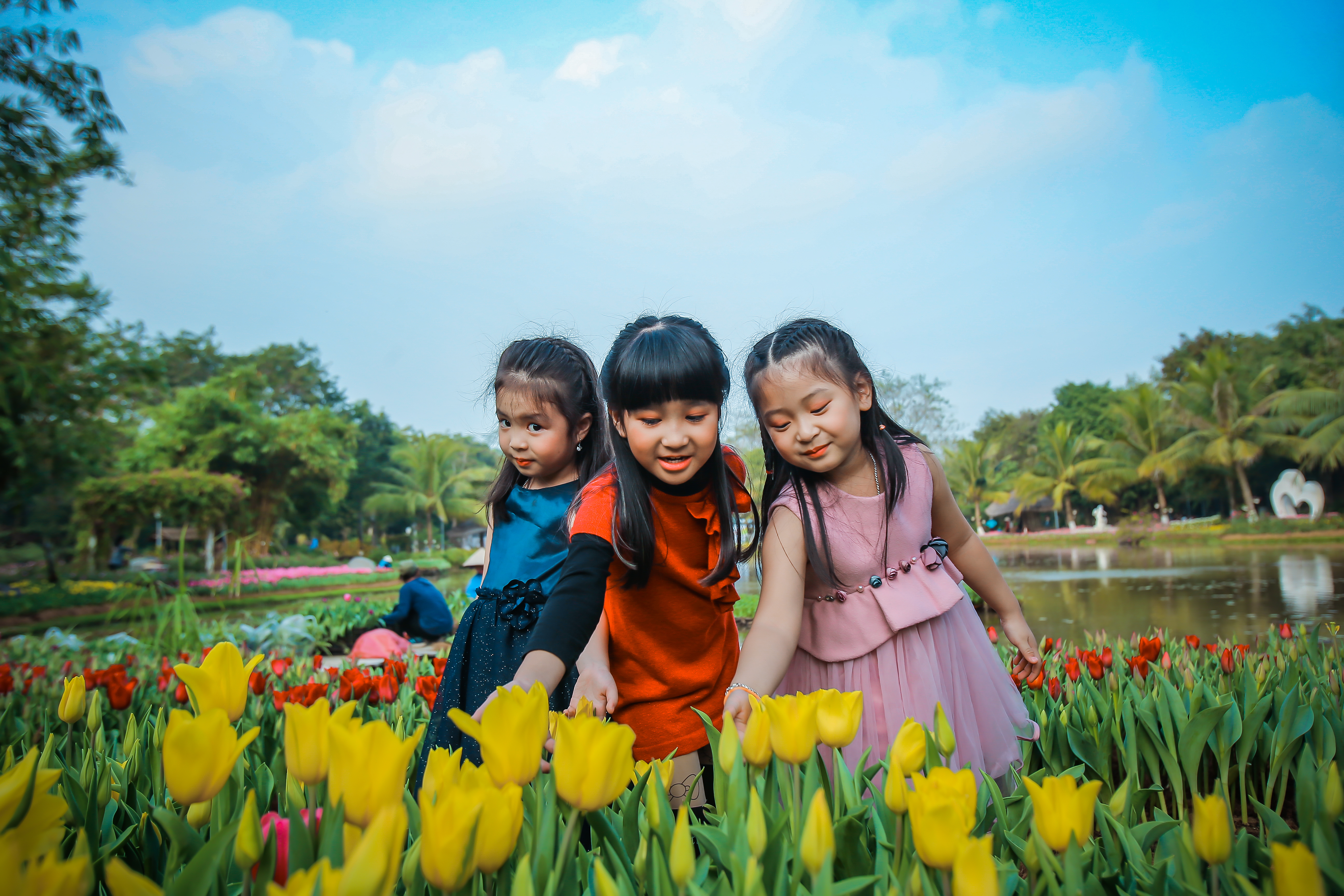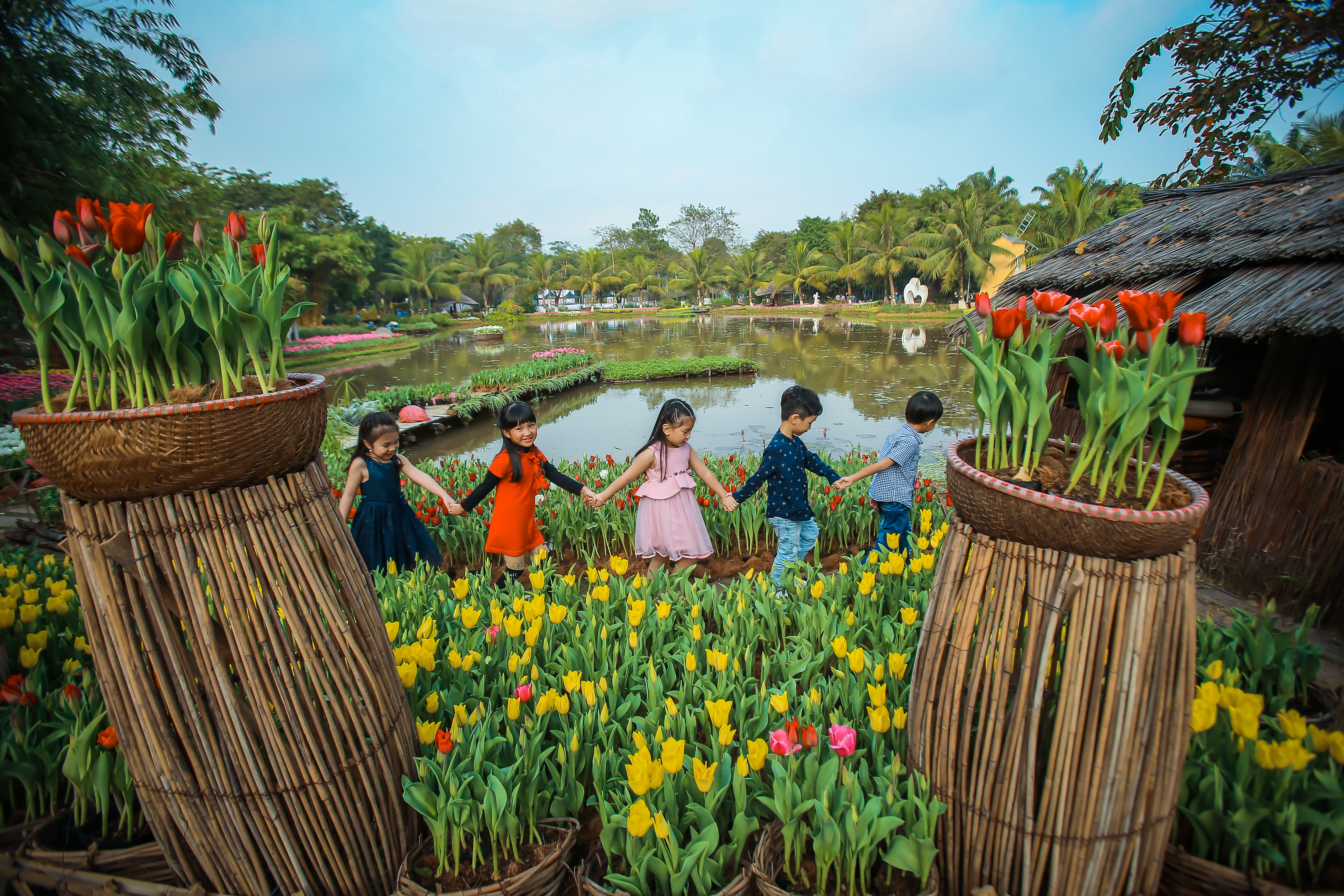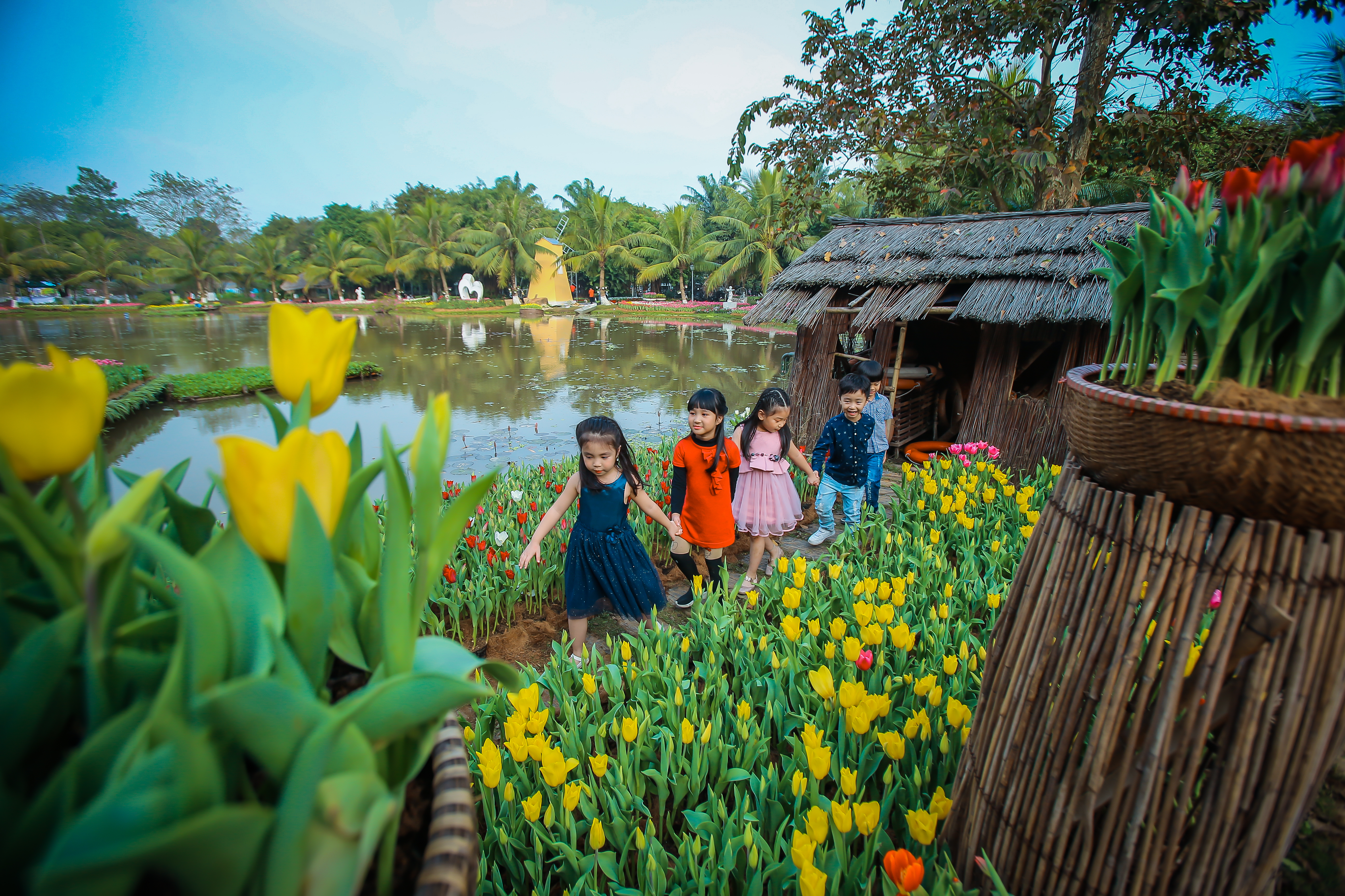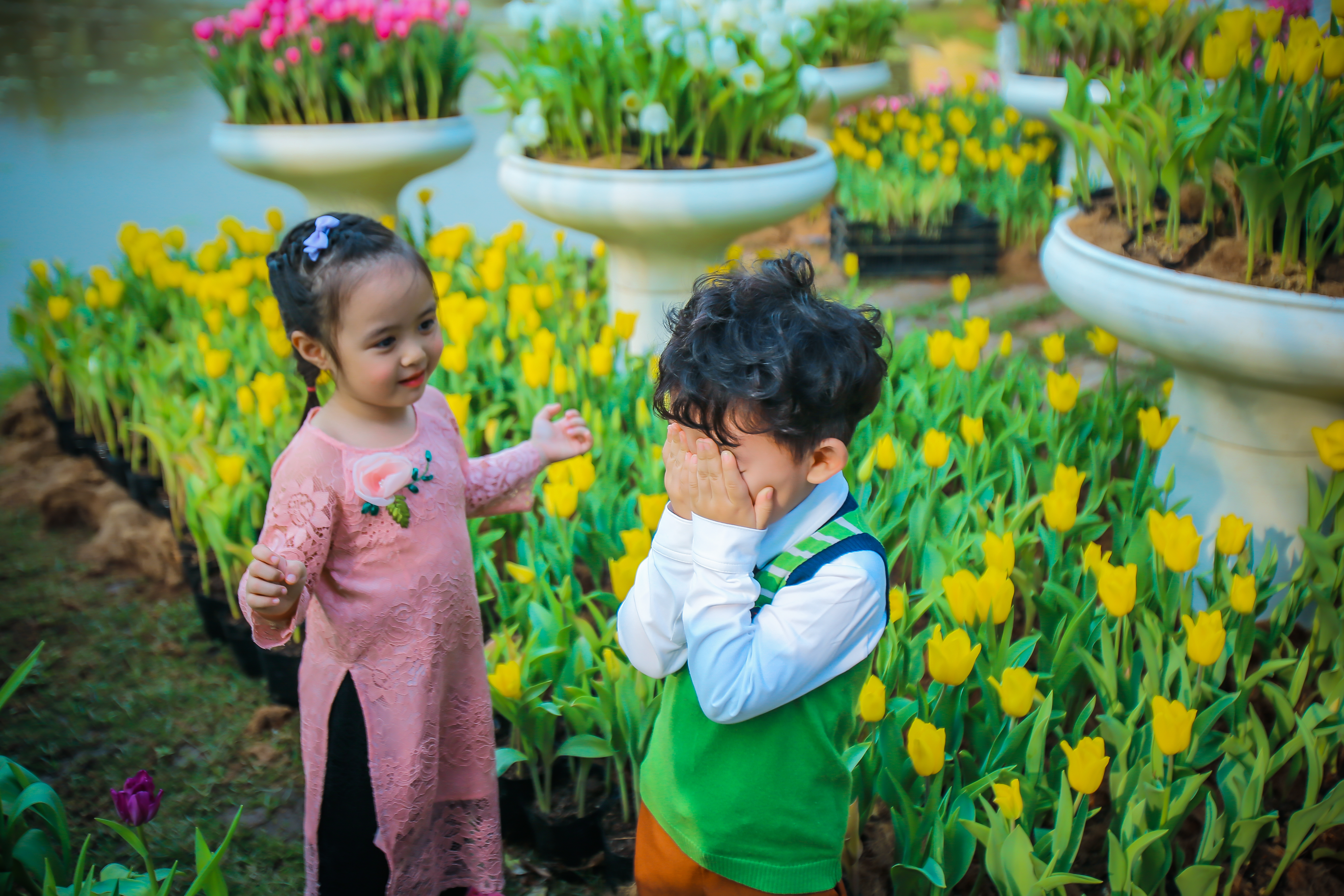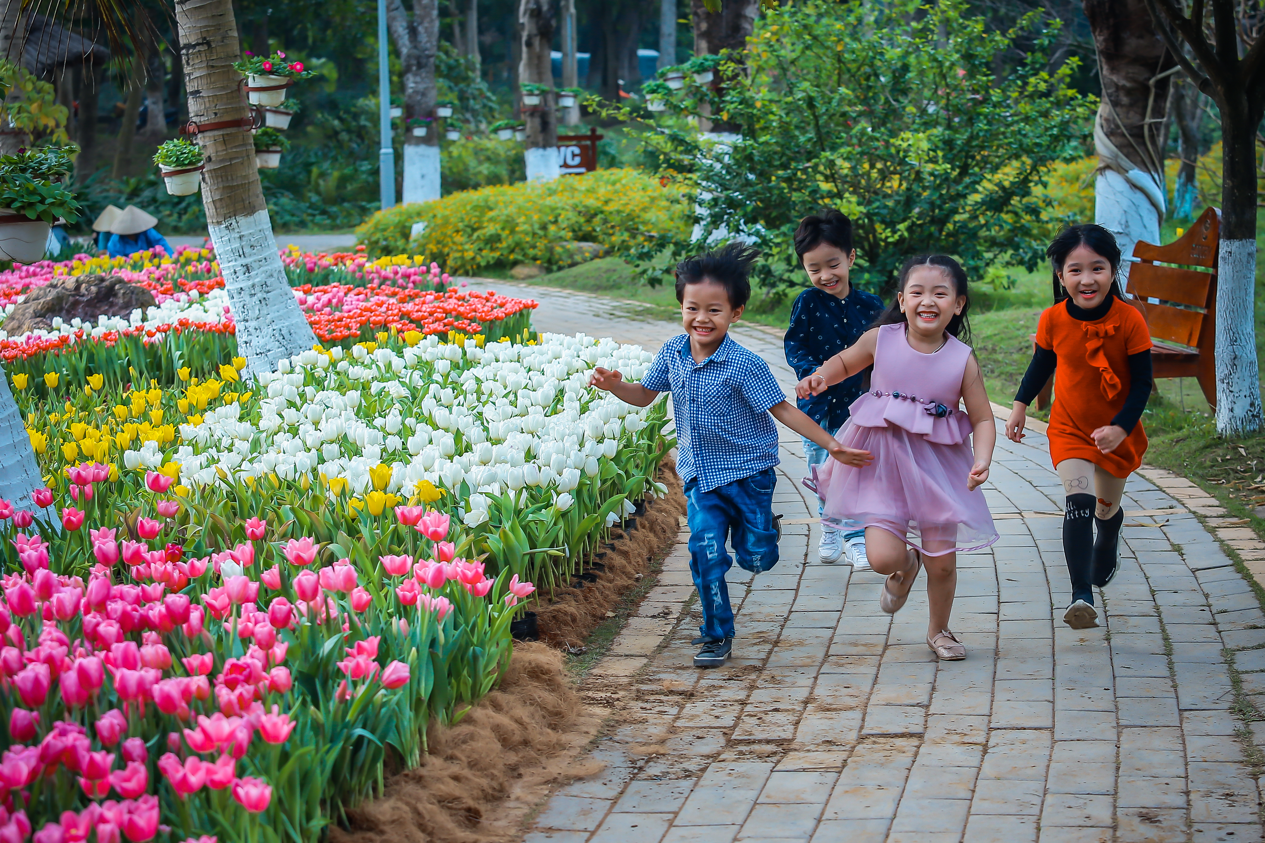 Các em nhỏ dắt tay nhau dạo quanh khu vườn ngập hoa tulip