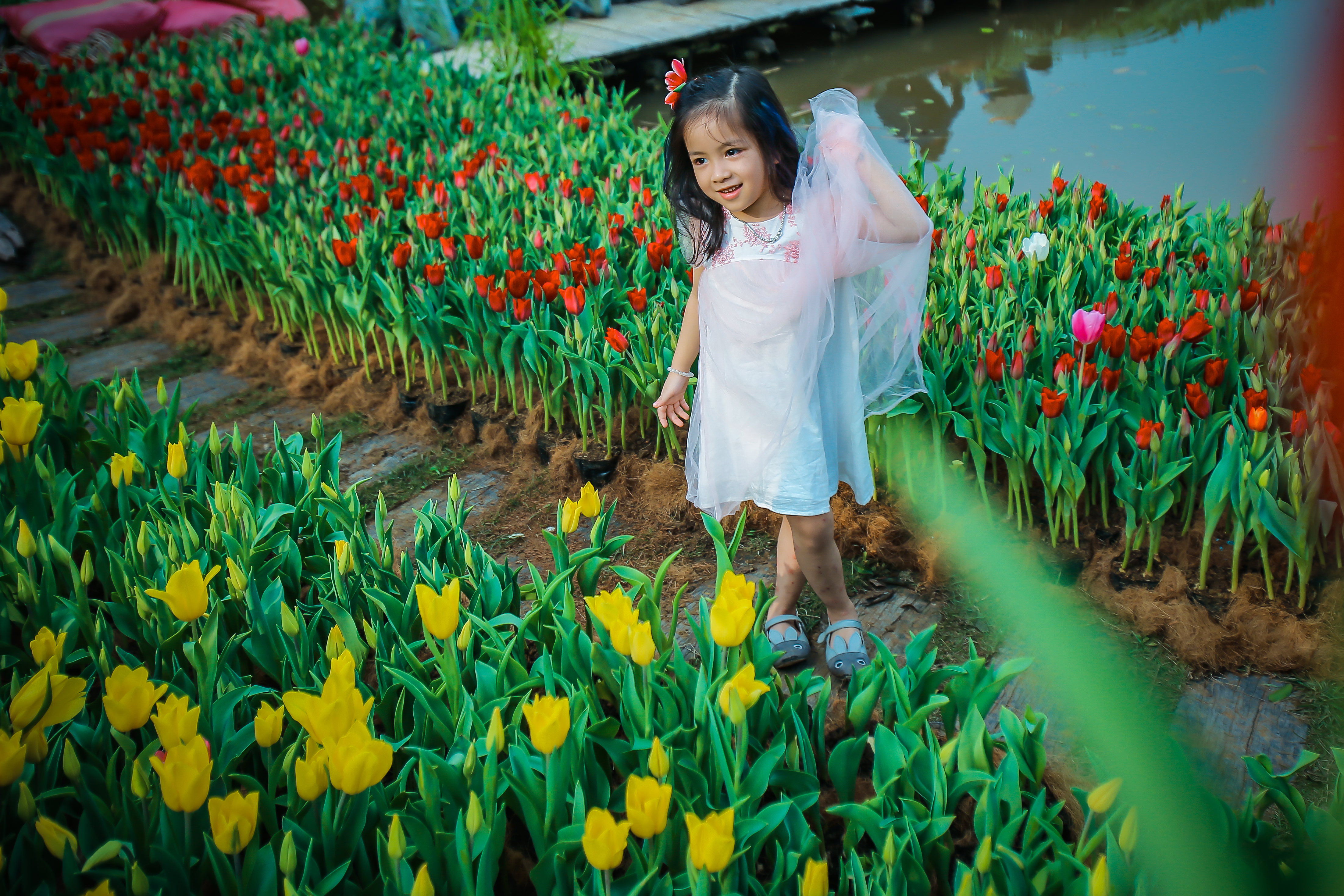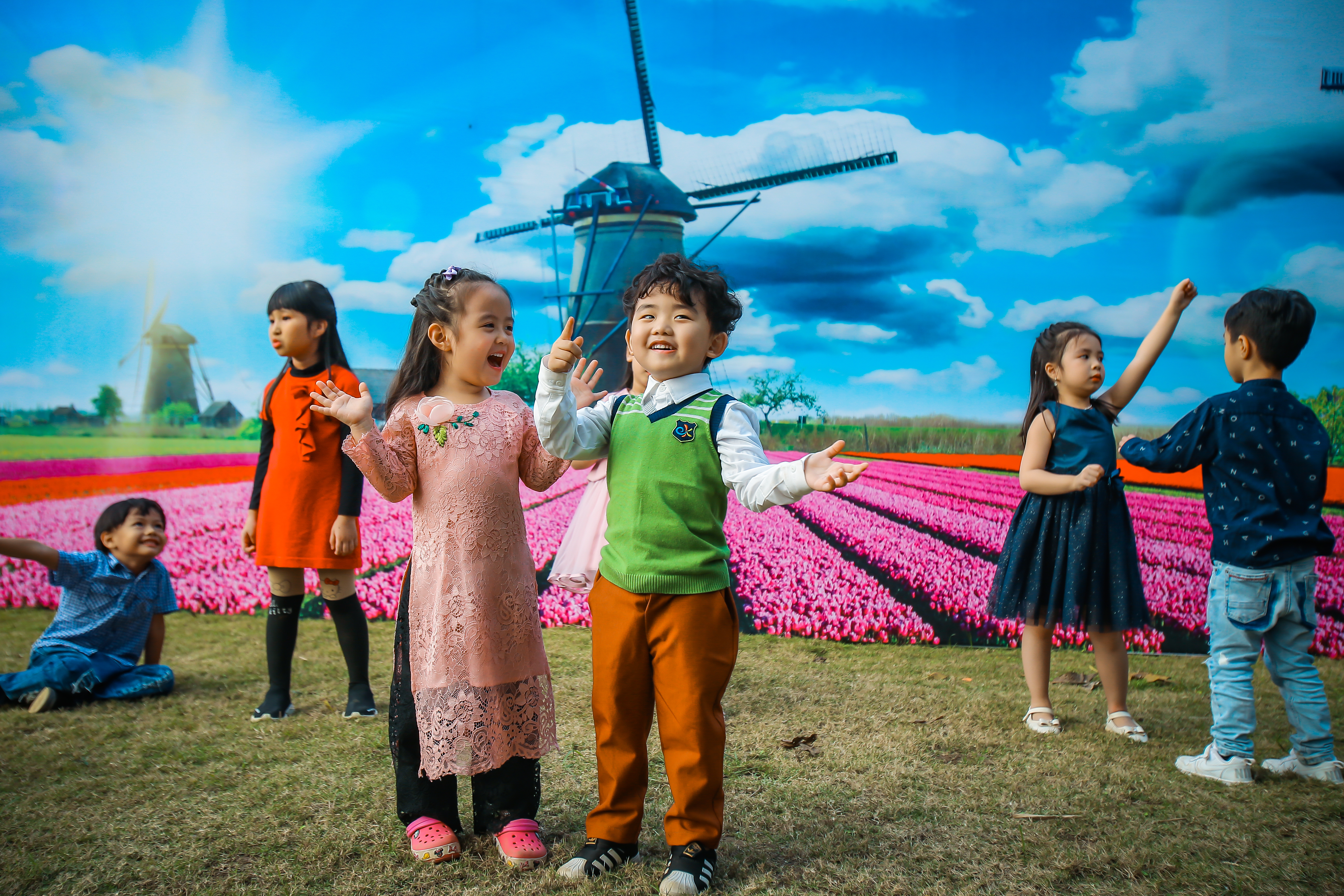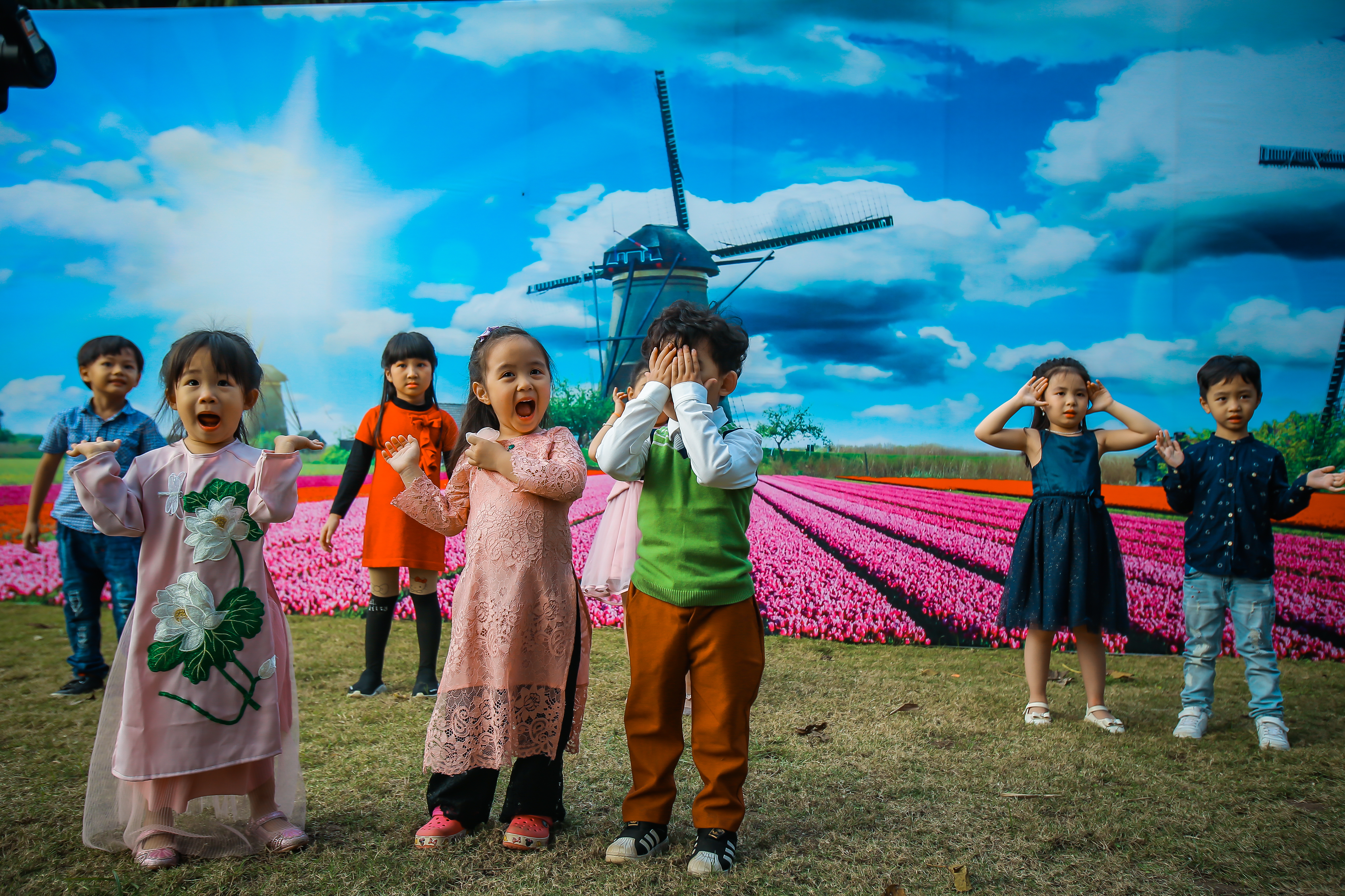 Những bông hoa tulip của Hà Lan làm các em tò mò, thích thú