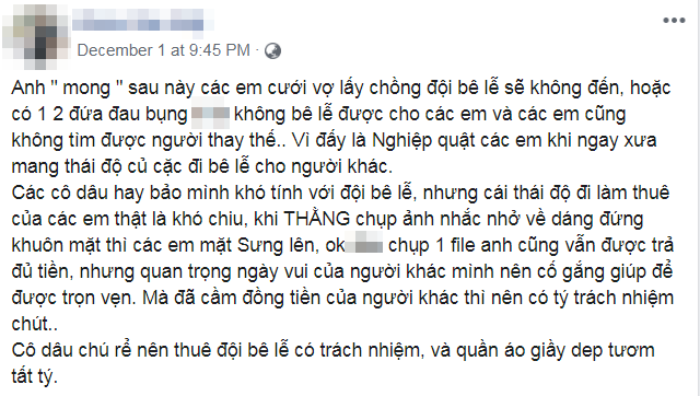 Mới đây, bài đăng của một nhiếp ảnh gia chia sẻ trên mạng xã hội một cách khá bức xúc về việc “nam thanh nữ tú” bê tráp hỏi với giày không phù hợp và thái độ khó chịu gây sự chú ý.