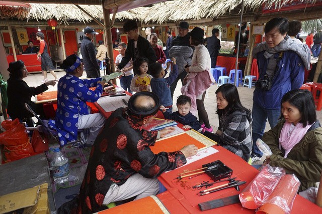 Nhiều gia đình cho trẻ nhỏ đi xin chữ ông đồ với mục đích giúp con hiểu được ý nghĩa của tục xin chữ và mong muốn cầu may. Ảnh: Thanh niên.