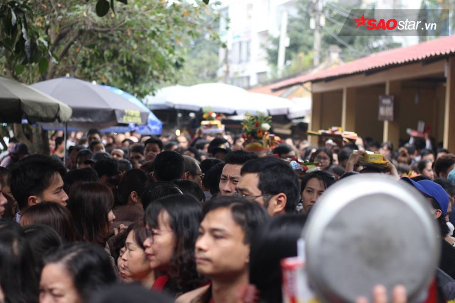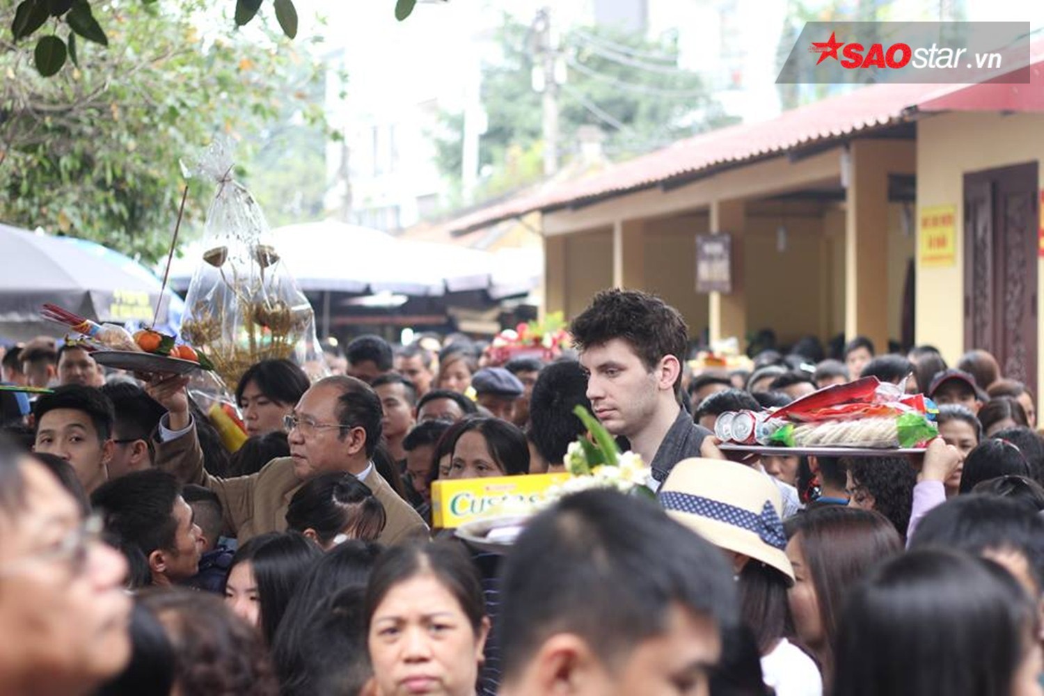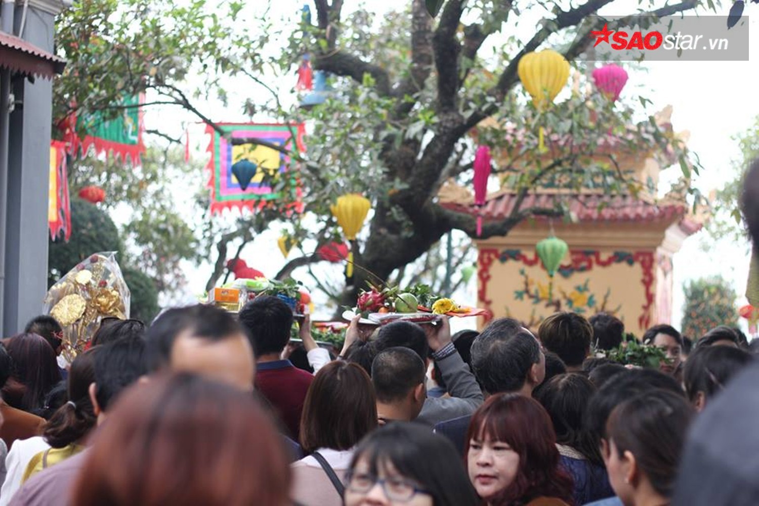 Đường đông nên mọi người phải đội lễ lên đầu, di chuyển chậm chạp.