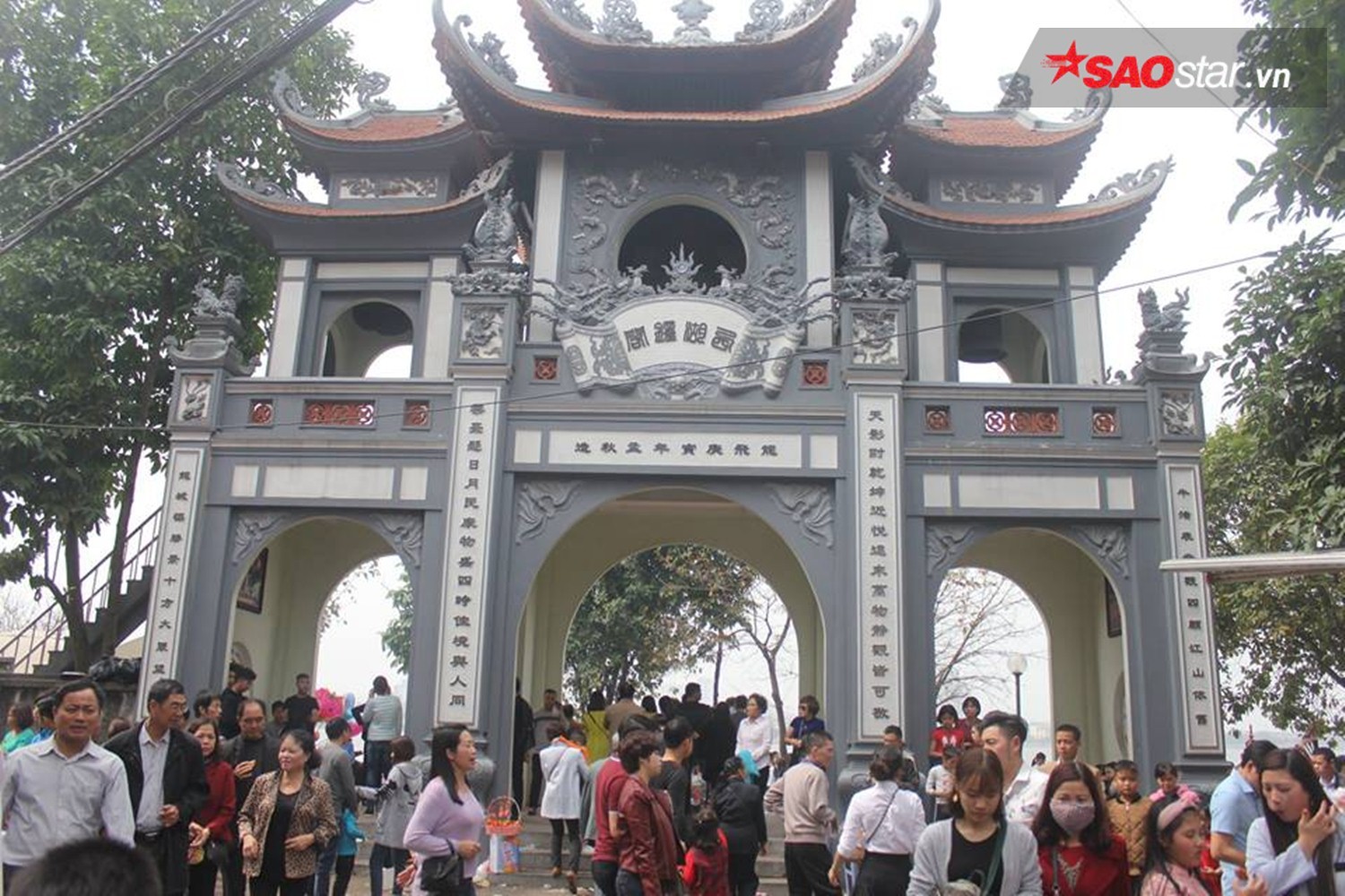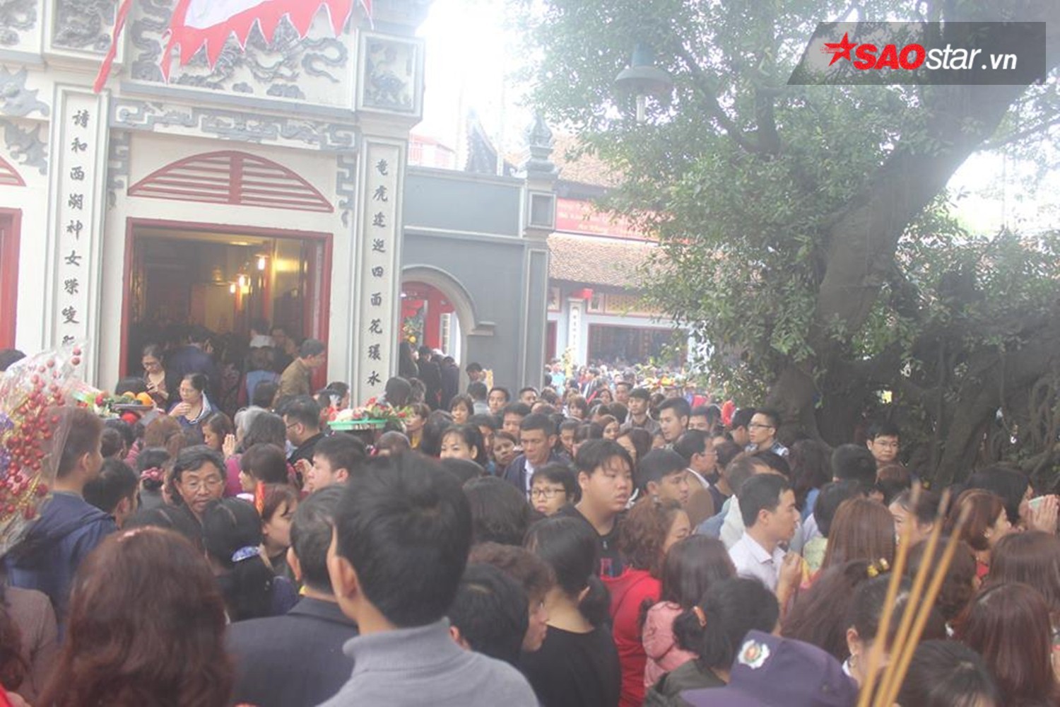Lượng người đổ về Phủ Tây Hồ tăng cao khiến lối dẫn vào điện thờ chính kẹt cứng.