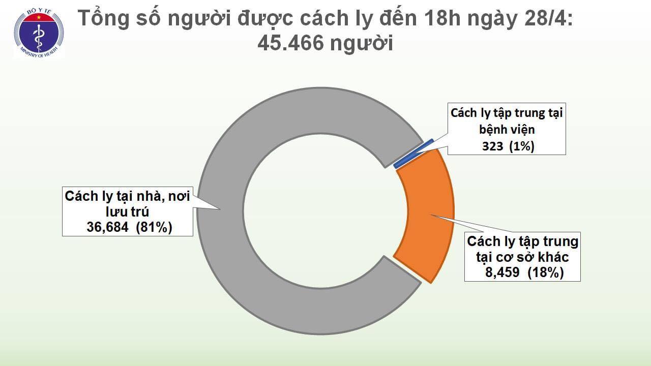 Tổng số người tiếp xúc gần và nhập cảnh từ vùng dịch đang được theo dõi sức khỏe (cách ly): 45.466, trong đó: Cách ly tập trung tại bệnh viện: 323. Cách ly tập trung tại cơ sở khác: 8.459. Cách ly tại nhà, nơi lưu trú: 36.684.