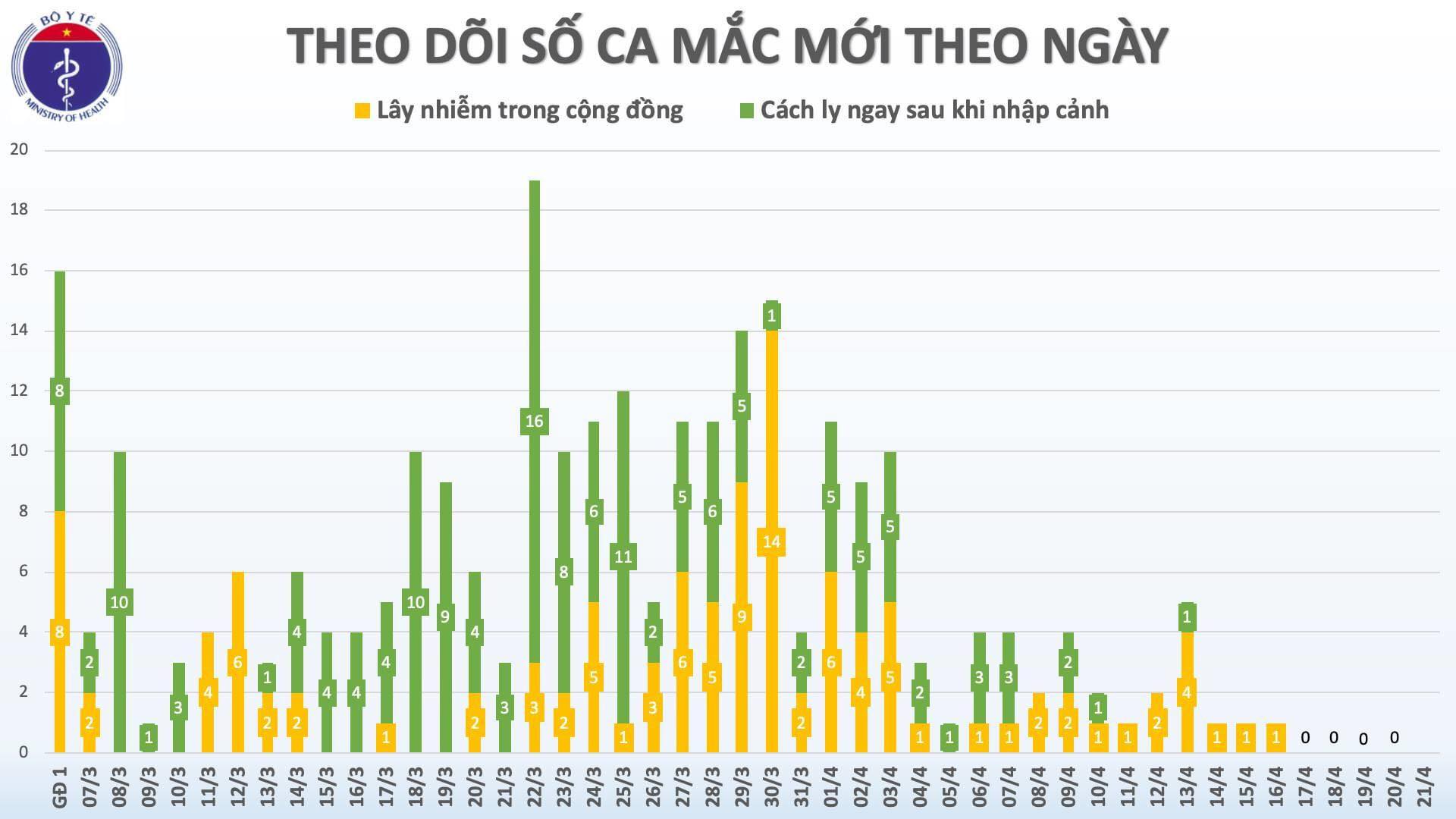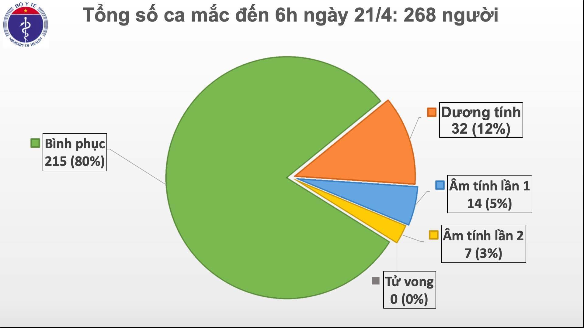 Thông tin từ Ban chỉ đạo quốc gia phòng chống dịch COVID-19, tính đến 6h ngày 21/4, Việt Nam ghi nhận 268 ca nhiễm. Đây cũng là ngày thứ 5 liên tiếp không ghi nhận thêm trường hợp nhiễm COVID-19 mới.