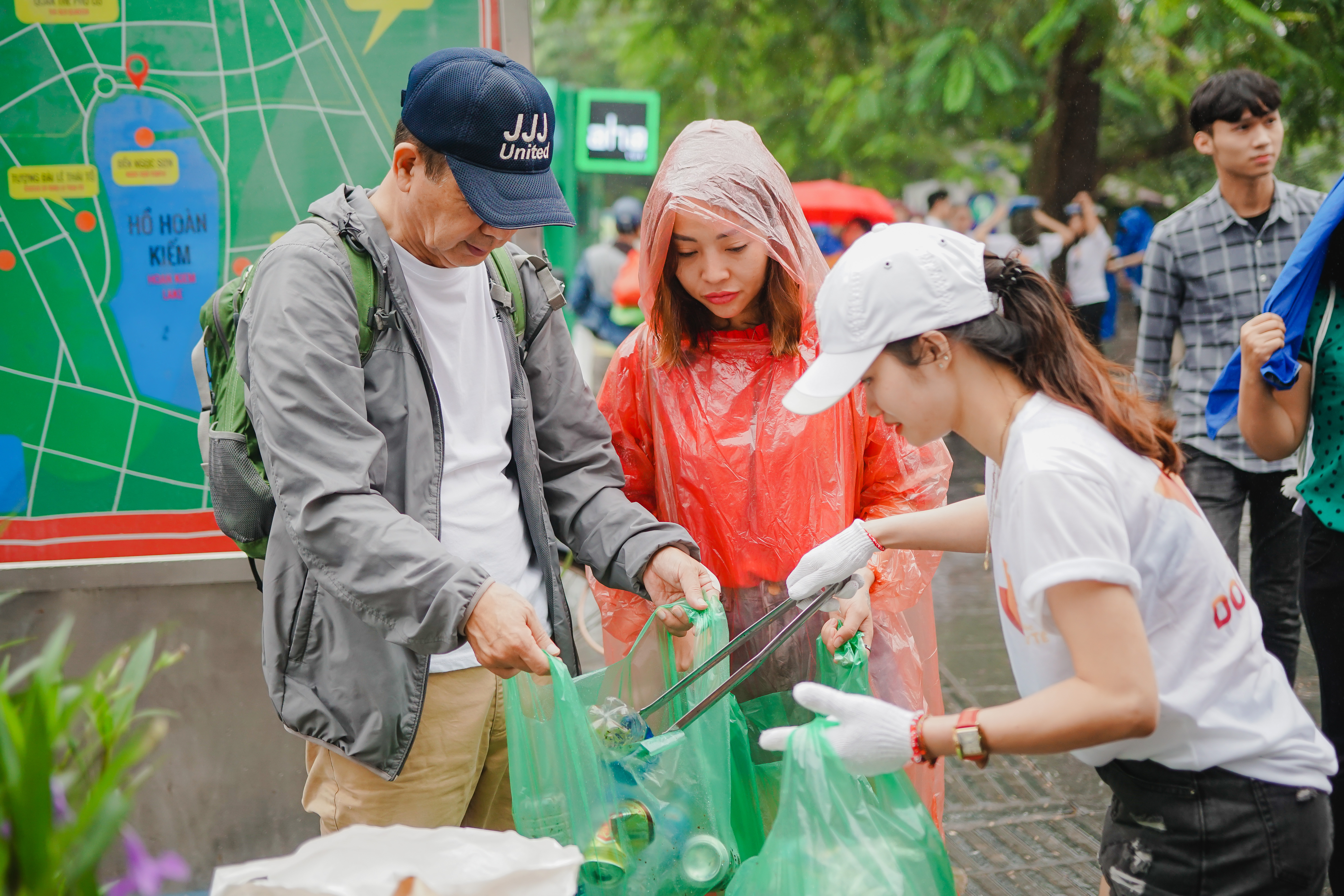 Mọi người tham gia gom rác, phân loại rác quanh khu vực Hồ Hoàn Kiếm.